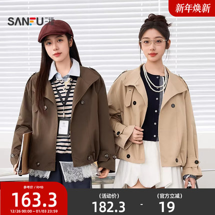 三福短款风衣女2025新款秋季小个子系扣双排扣宽松外套女装507331