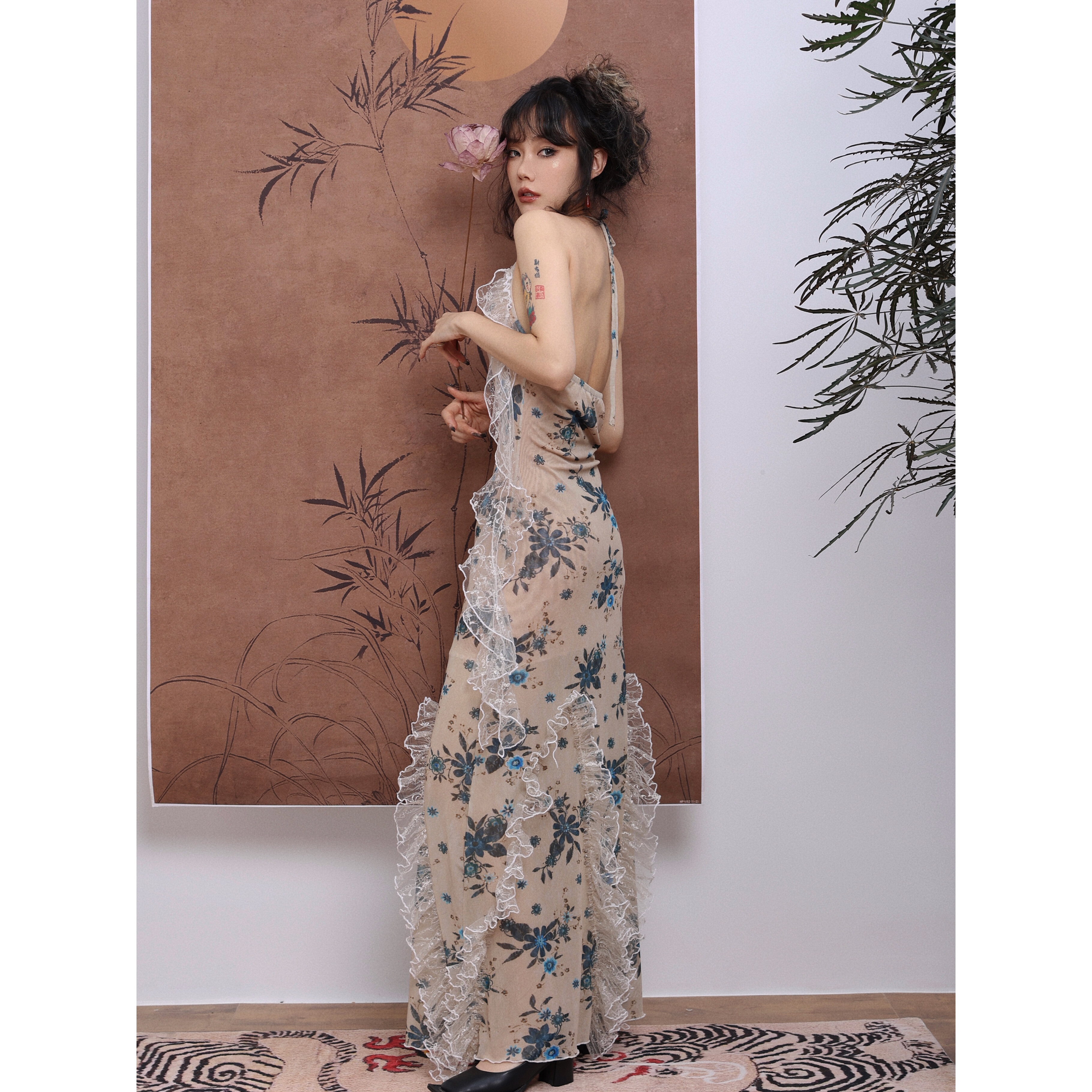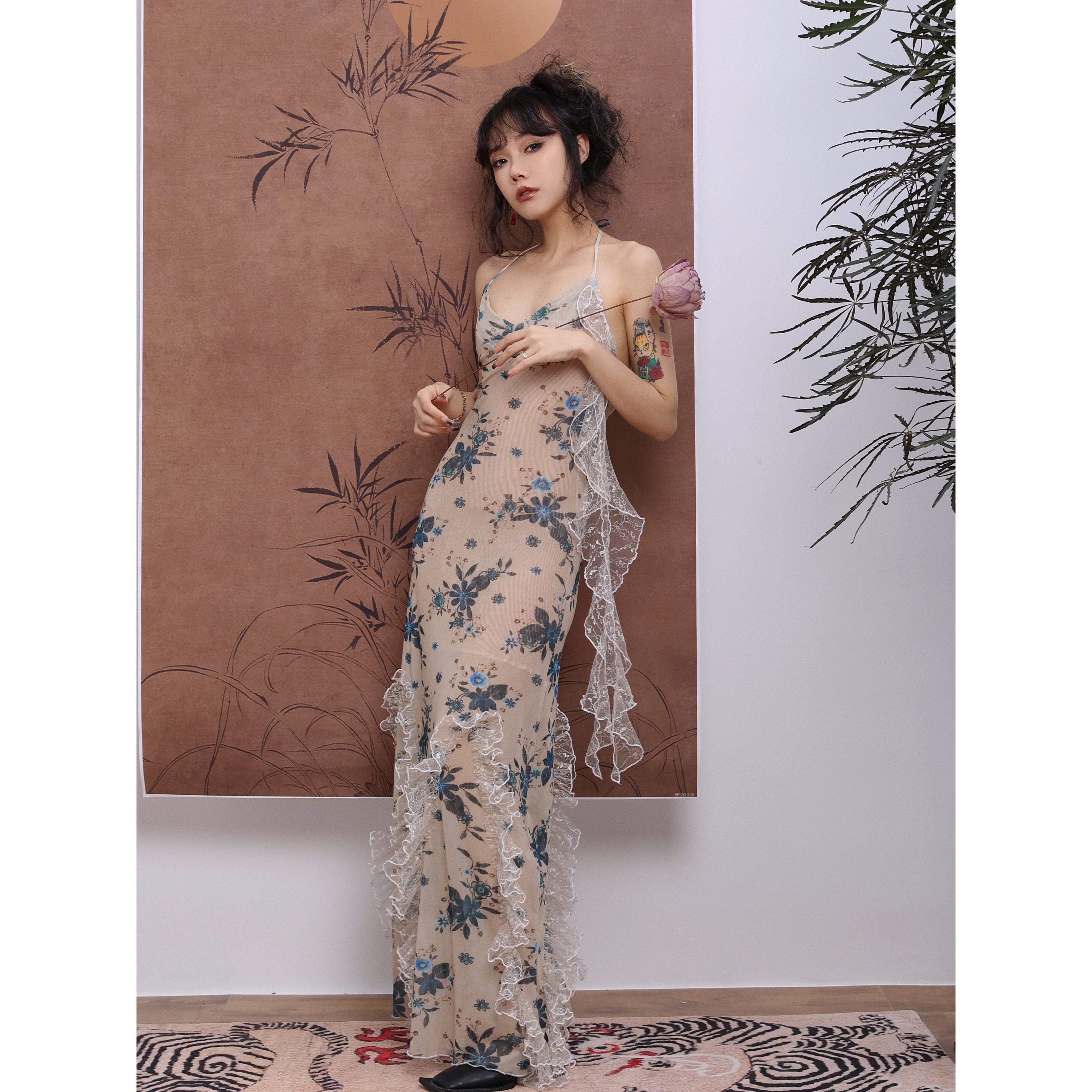 畔喜鱼一 镂月裁云原创设计印花蕾丝吊带连衣裙复古气质收腰长裙