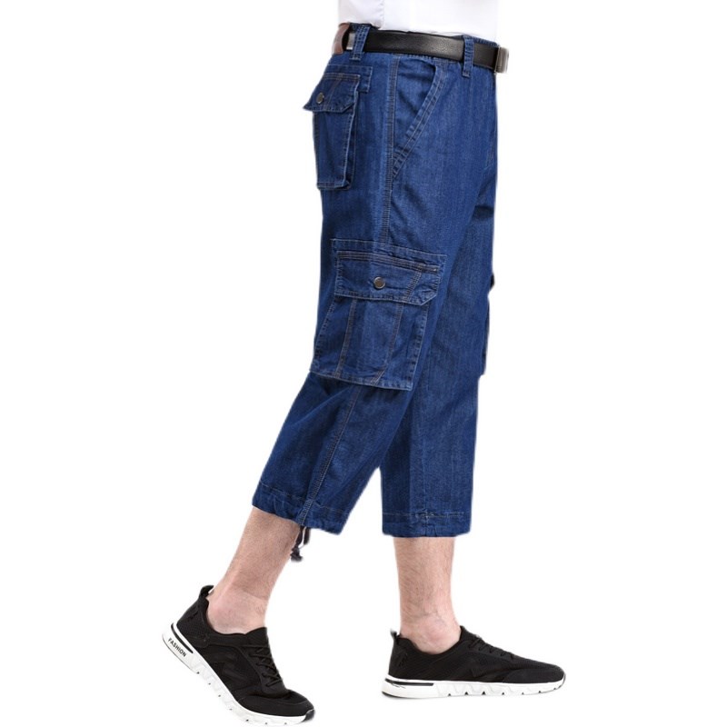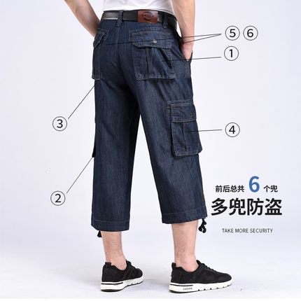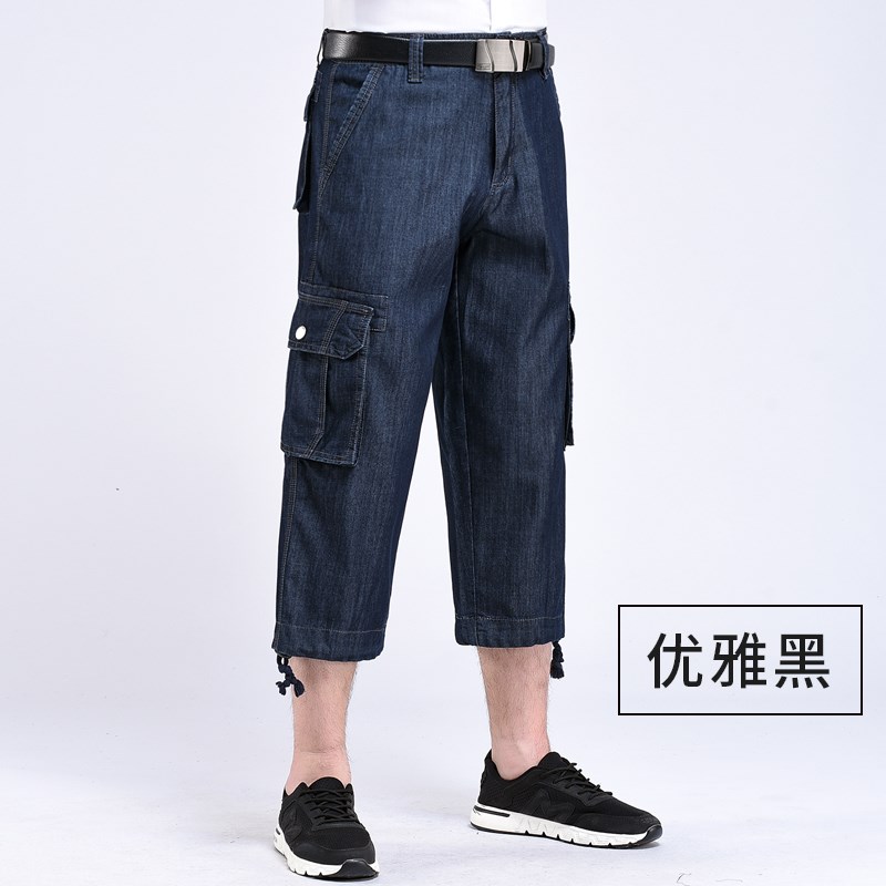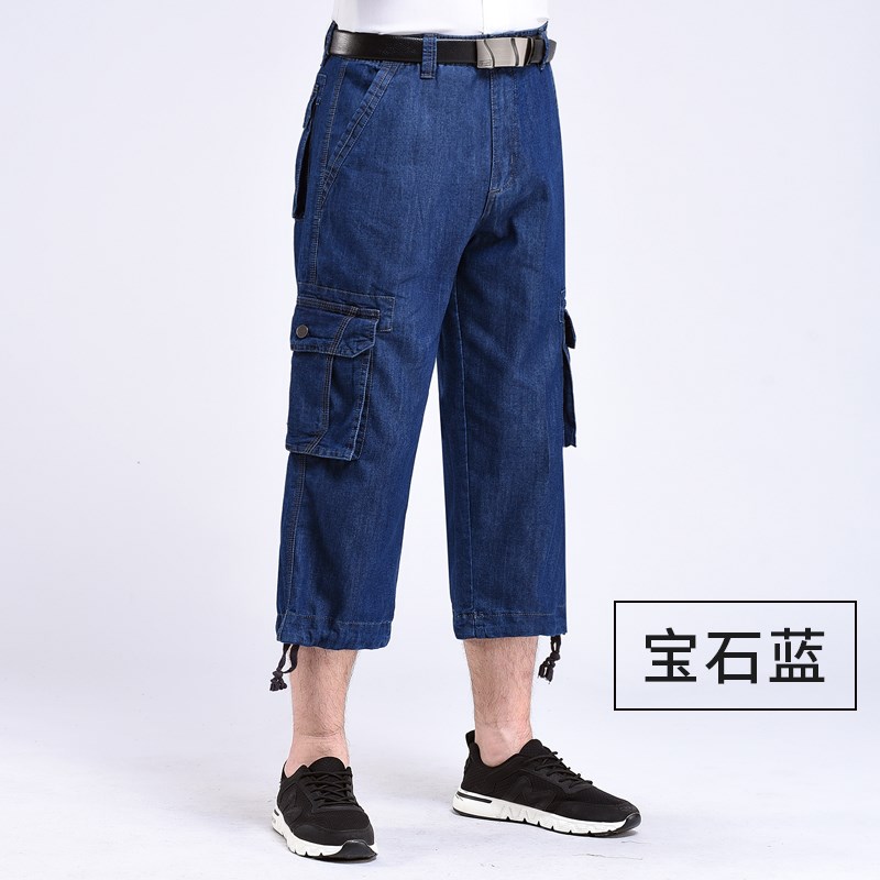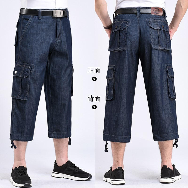 夏季薄款牛仔裤男宽松大码工装裤多口袋裤男式户外休闲牛仔7分裤