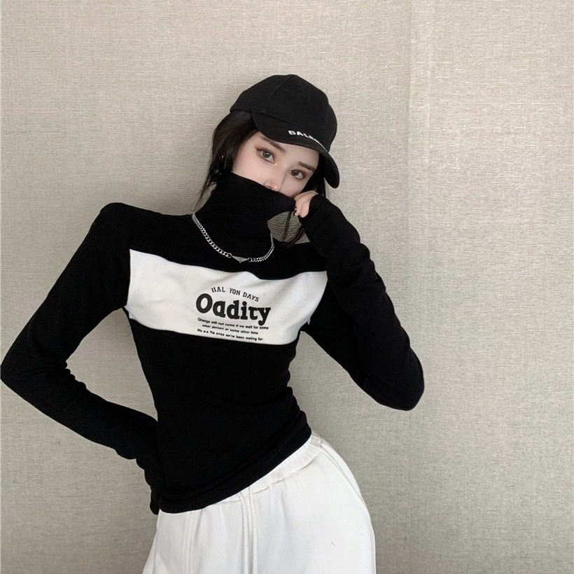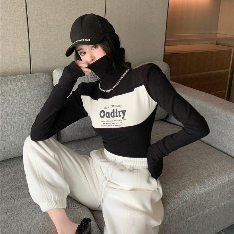 纯欲辣妹高领拼色字母长袖T恤女秋冬内搭短款德绒磨毛加厚打底衫