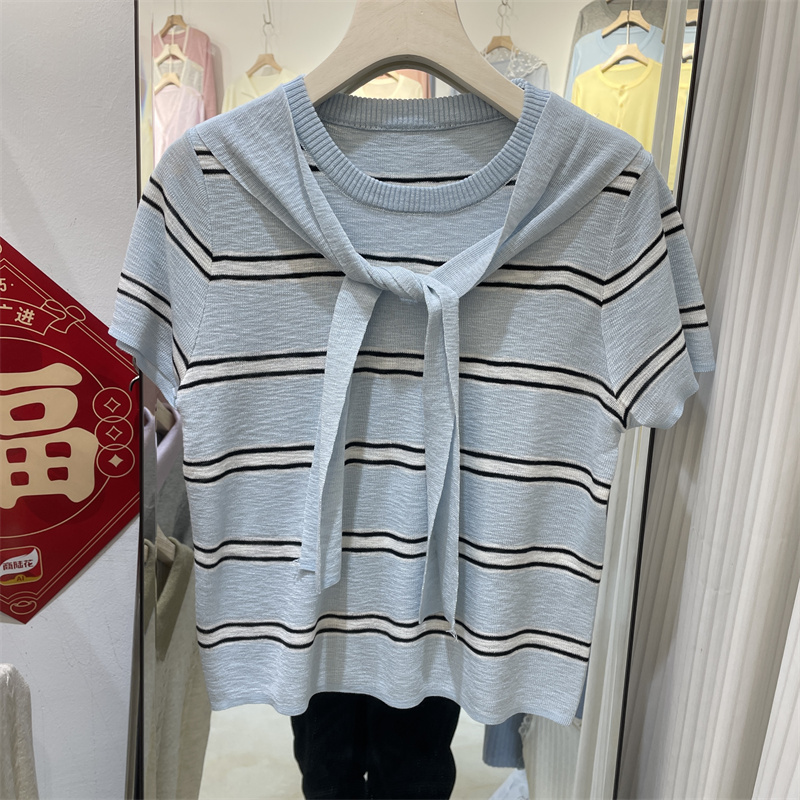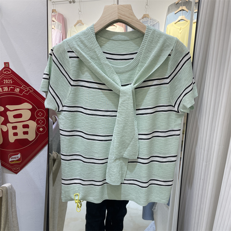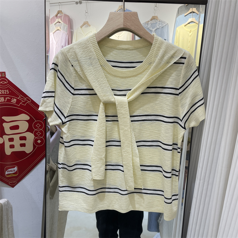 2025夏季女装上衣针织衫百搭显瘦小香风洋气简约设计条纹短袖麻料