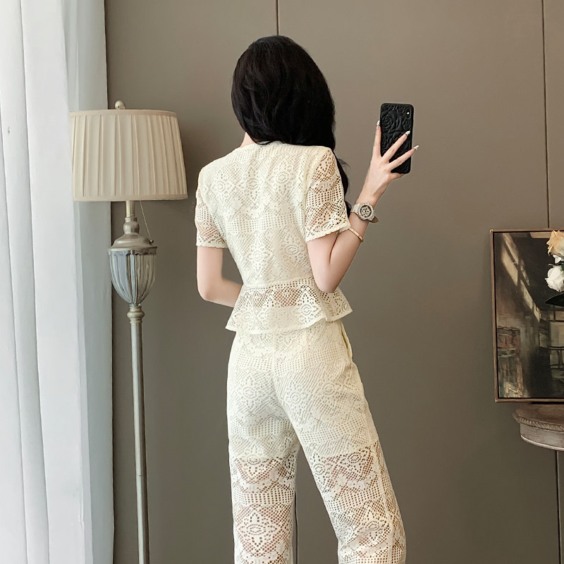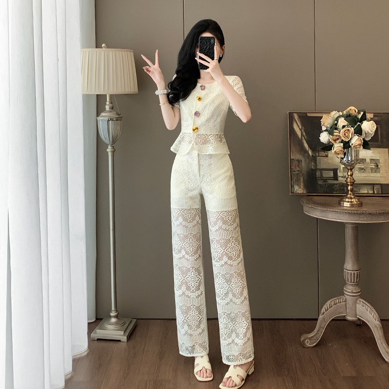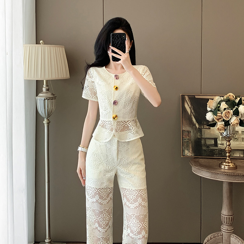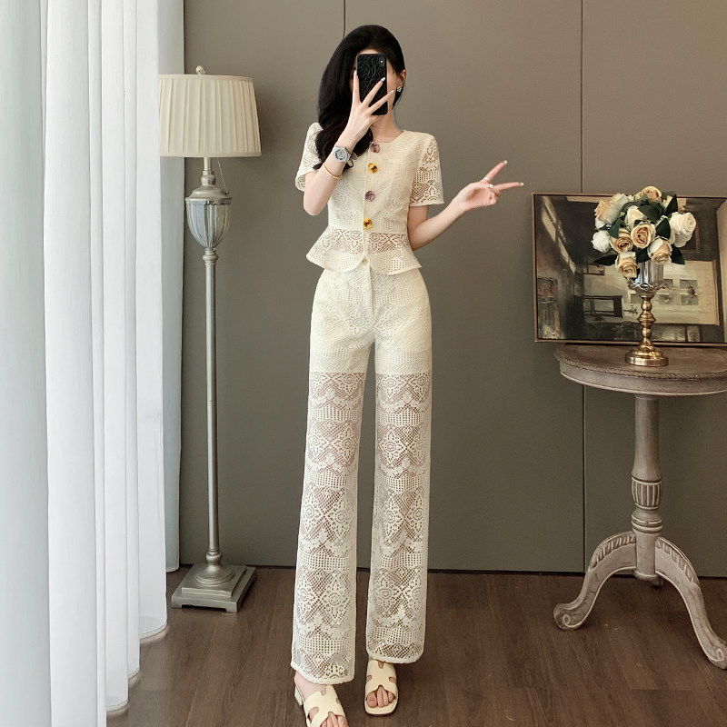 2025夏季新款时尚套装女装设计感小众气质显名媛阔腿裤两件套蕾丝