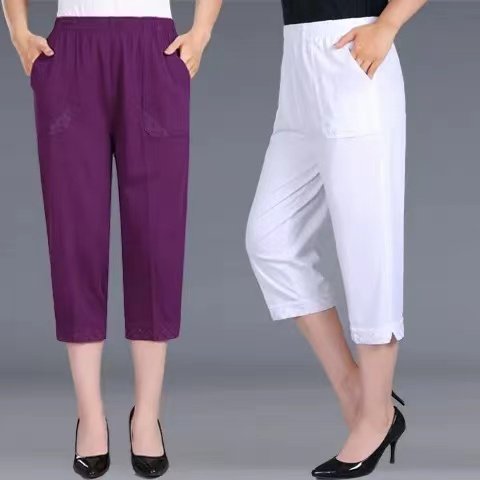妈妈裤子夏季薄款七分裤棉质白色夏凉裤中老年人奶奶妇女裤弹力棉