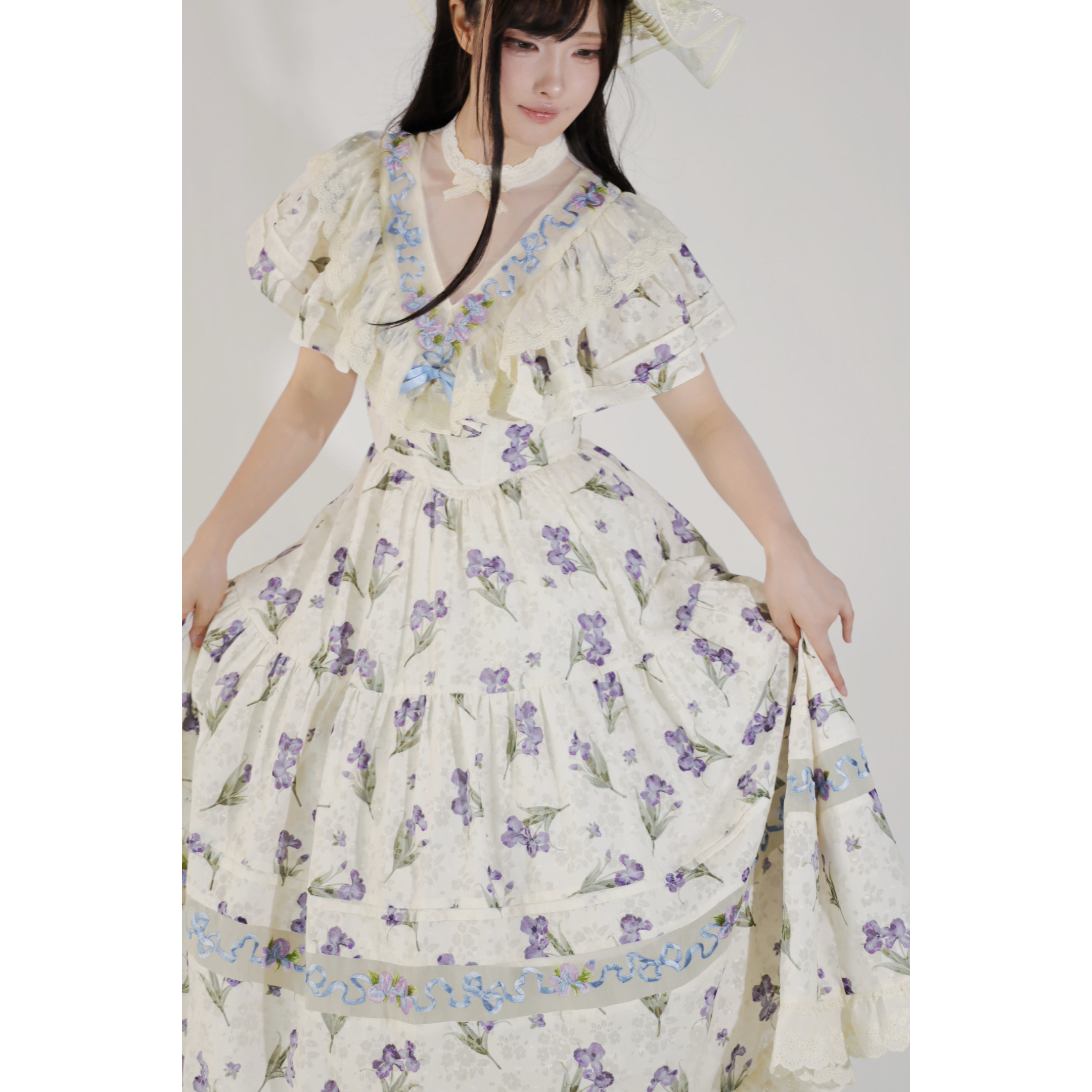 【全款现货】月下鸢尾OP飞袖爱德华领-青lo2025短袖复古连衣裙
