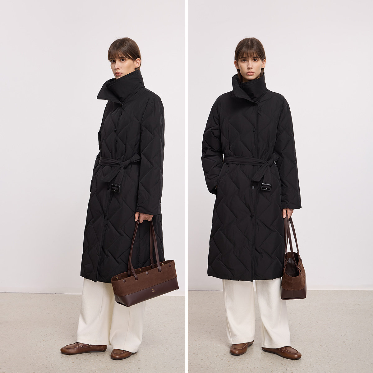 LILY2025冬新款女装复古立领翻领腰带收腰百搭通勤黑色羽绒服外套