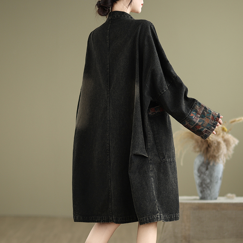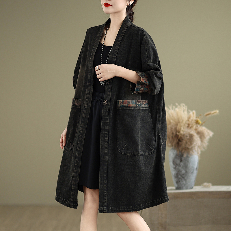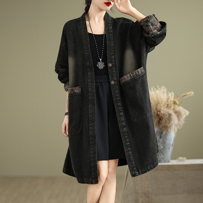 秋款外套复古V领大口袋牛仔外套宽松大版中长款风衣外套胖mm棉质