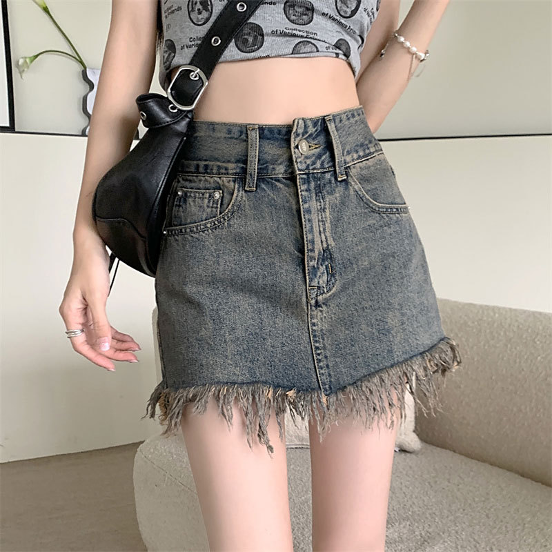 毛边牛仔半身裙女夏季高腰百搭流苏设计感小众包臀a字复古短裙子