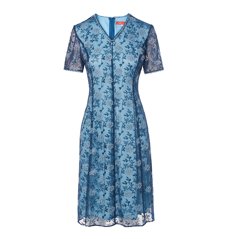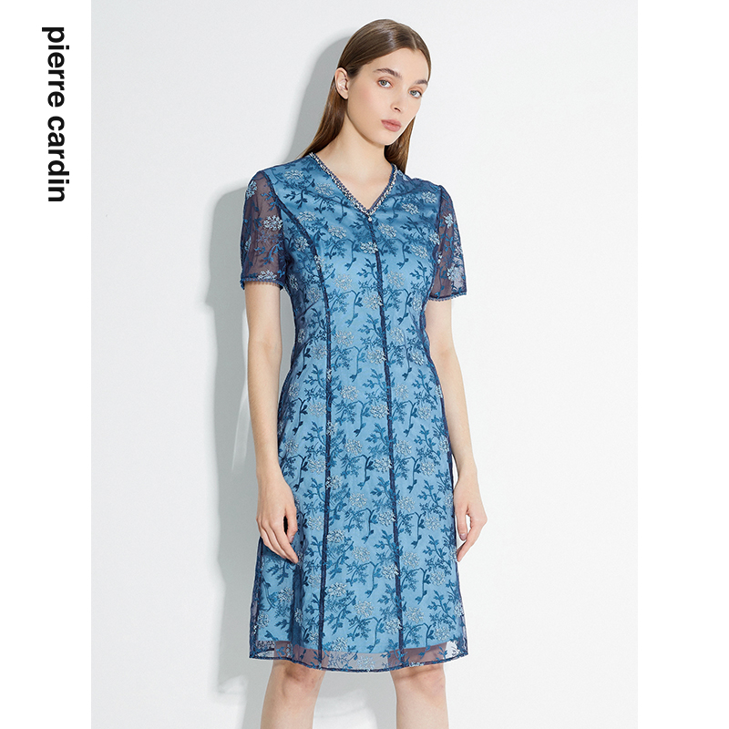 商场同款皮尔卡丹女装夏季新款立体刺绣蕾丝短袖连衣裙