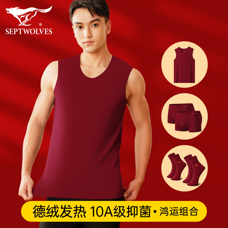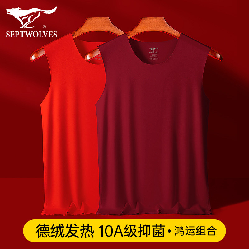 七匹狼保暖背心男士德绒发热无痕本命年红色马年结婚内衣打底汗衫