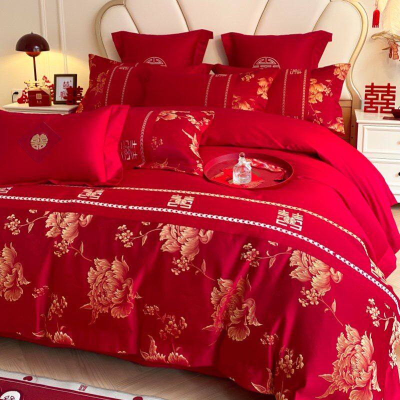 中式刺绣结婚四件套大红色新婚床单被套婚庆床上用品婚房陪嫁