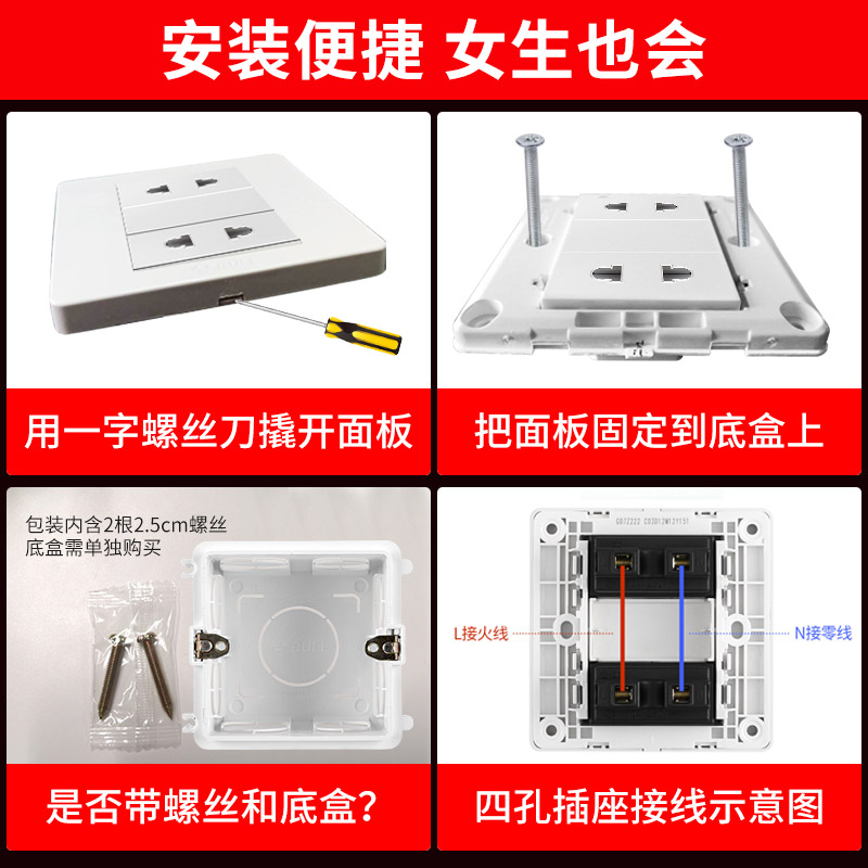 公牛4孔四孔插座面板双二极四眼插86型开关插座双位墙壁暗装面板