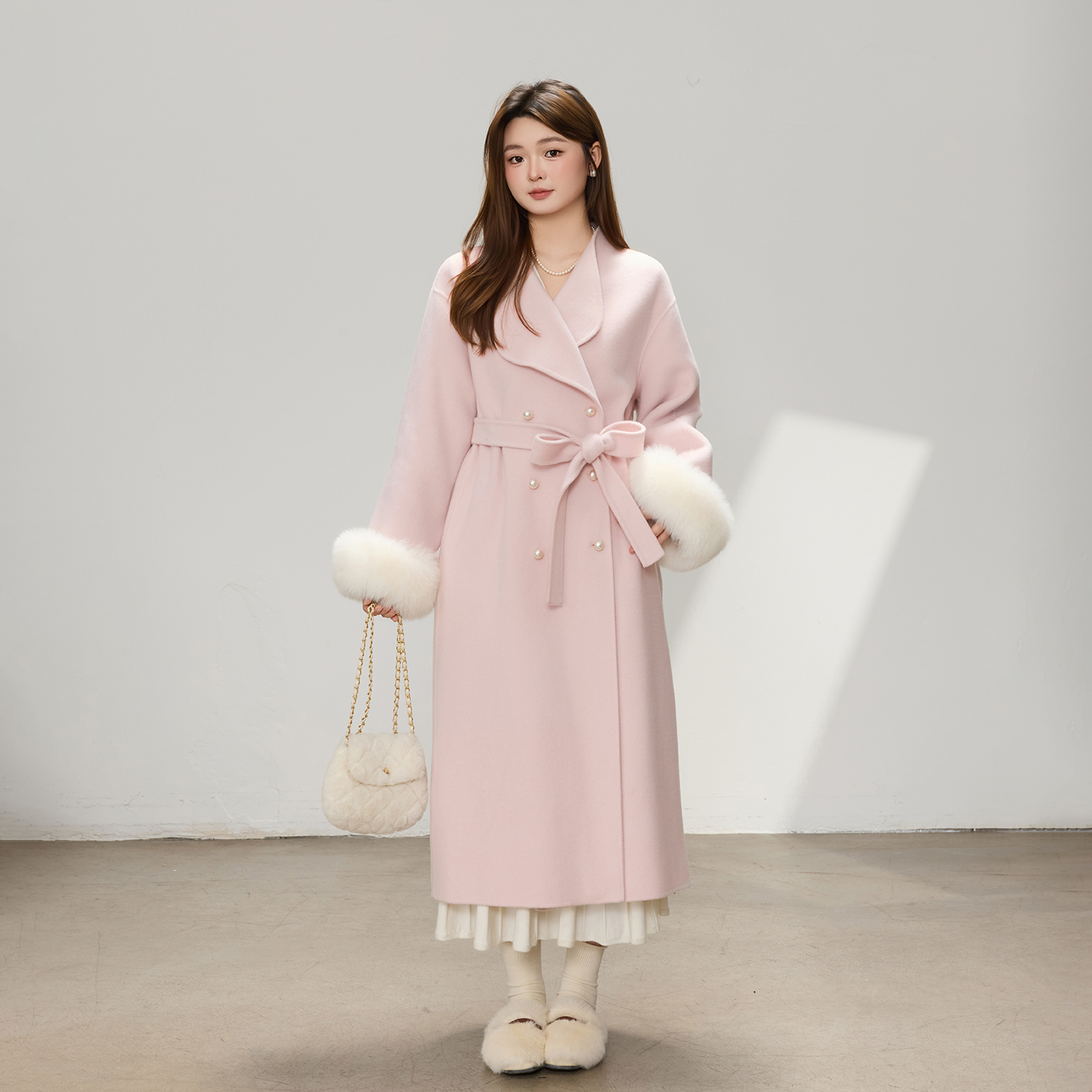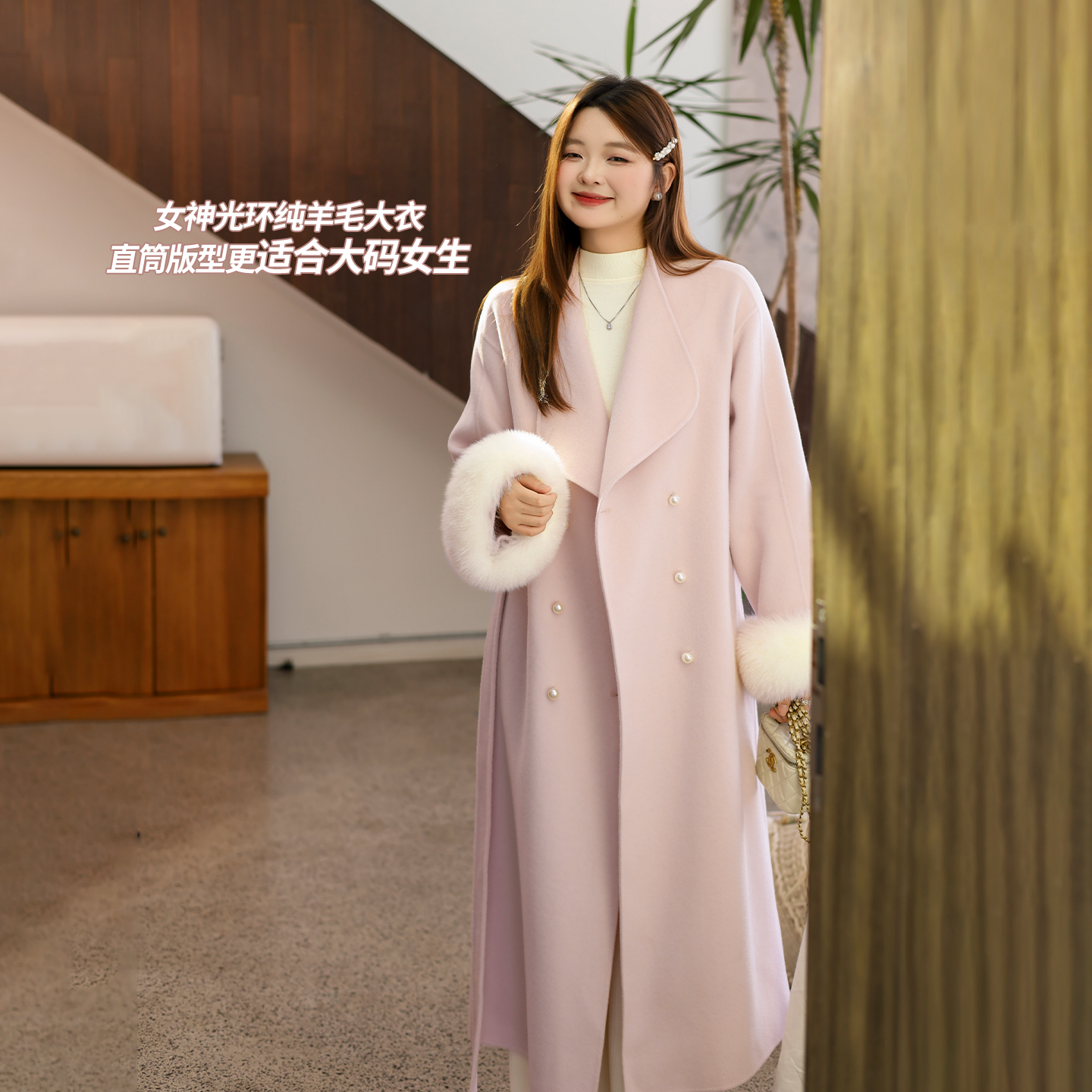 DM100大码百分百女装微胖mm温柔大气宽松狐狸毛圈双面呢羊毛大衣