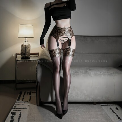 0D豹纹极光油亮长筒袜分体吊带袜