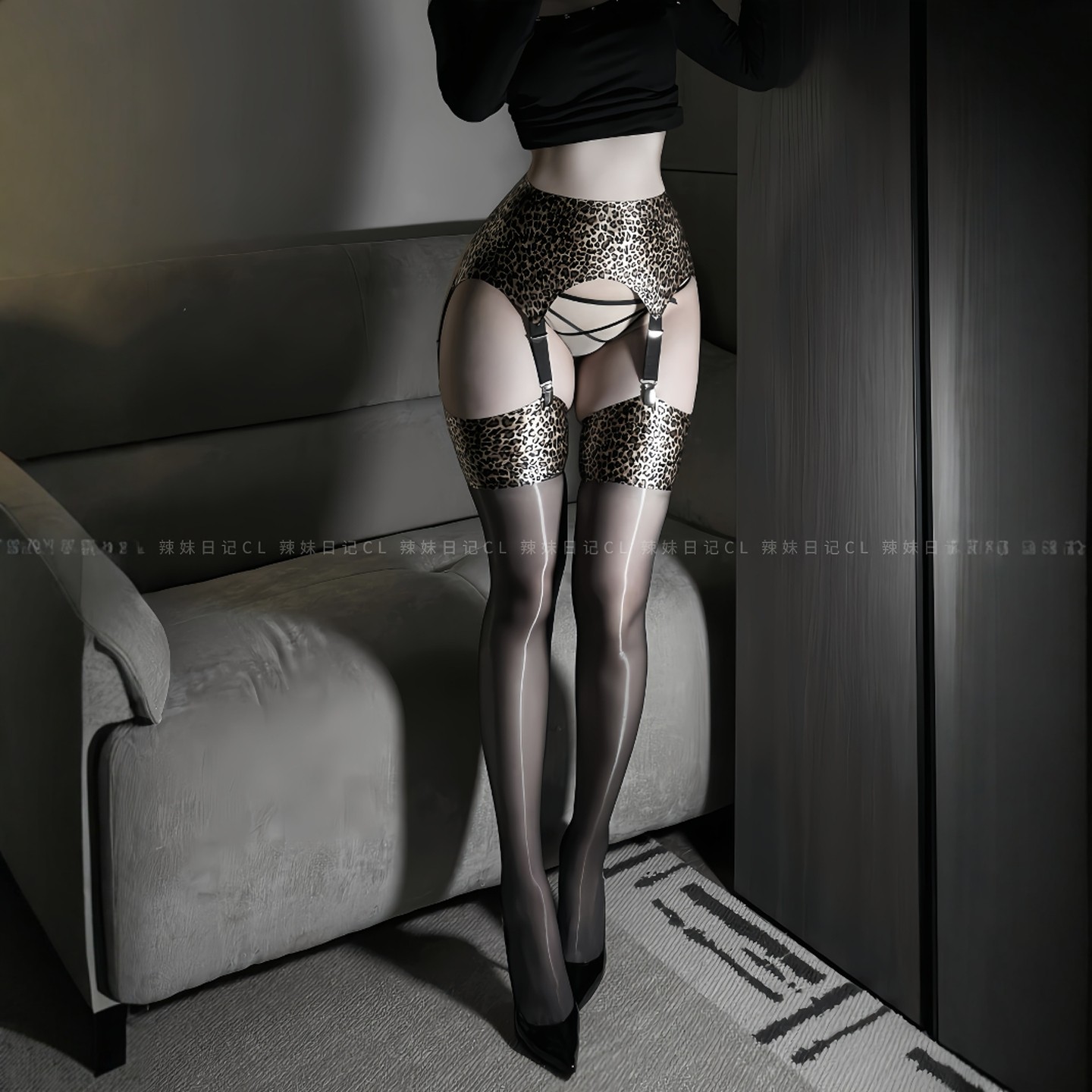 辣妹日记CL「猎手」0D极光豹纹性感黑丝吊带丝袜超薄油亮长筒袜女