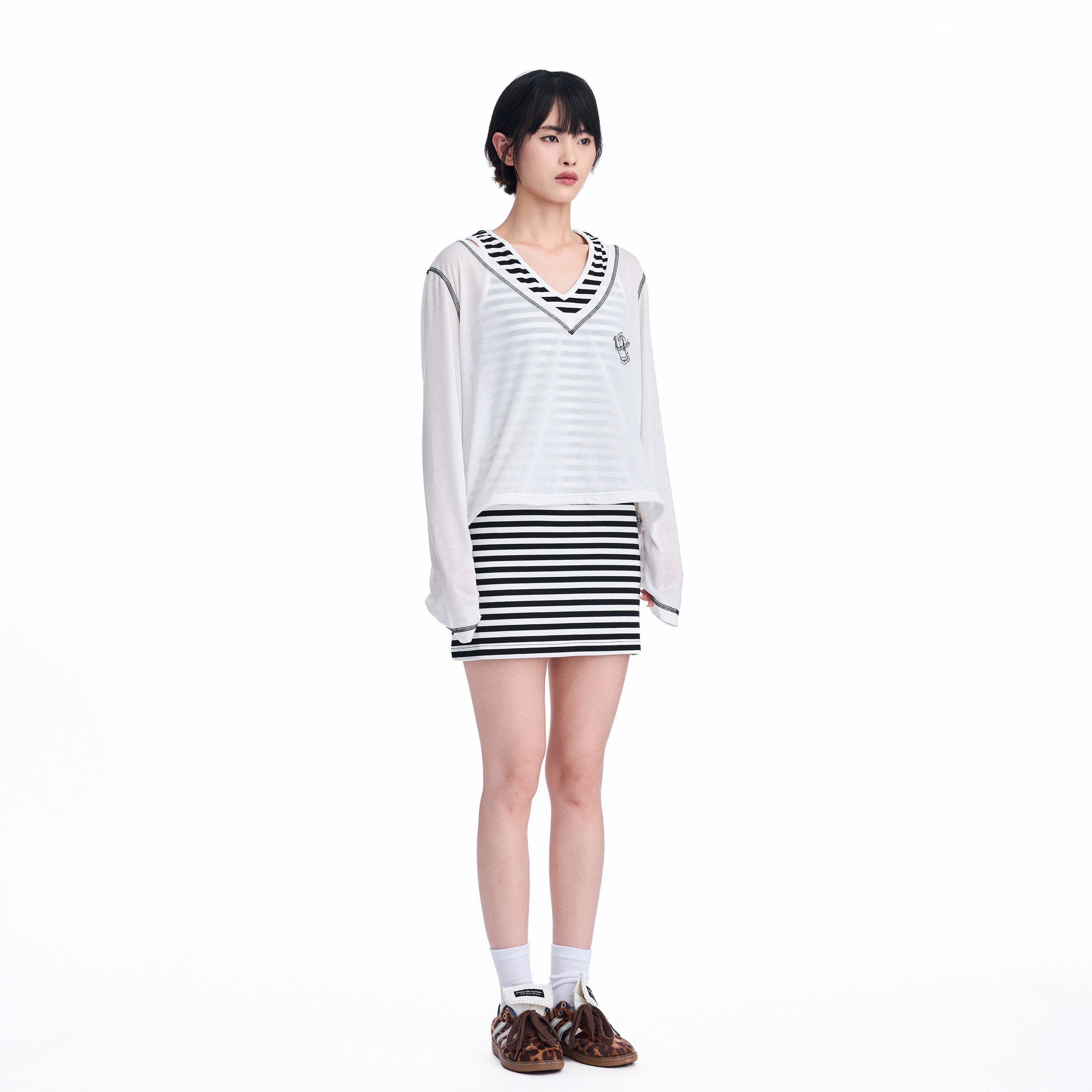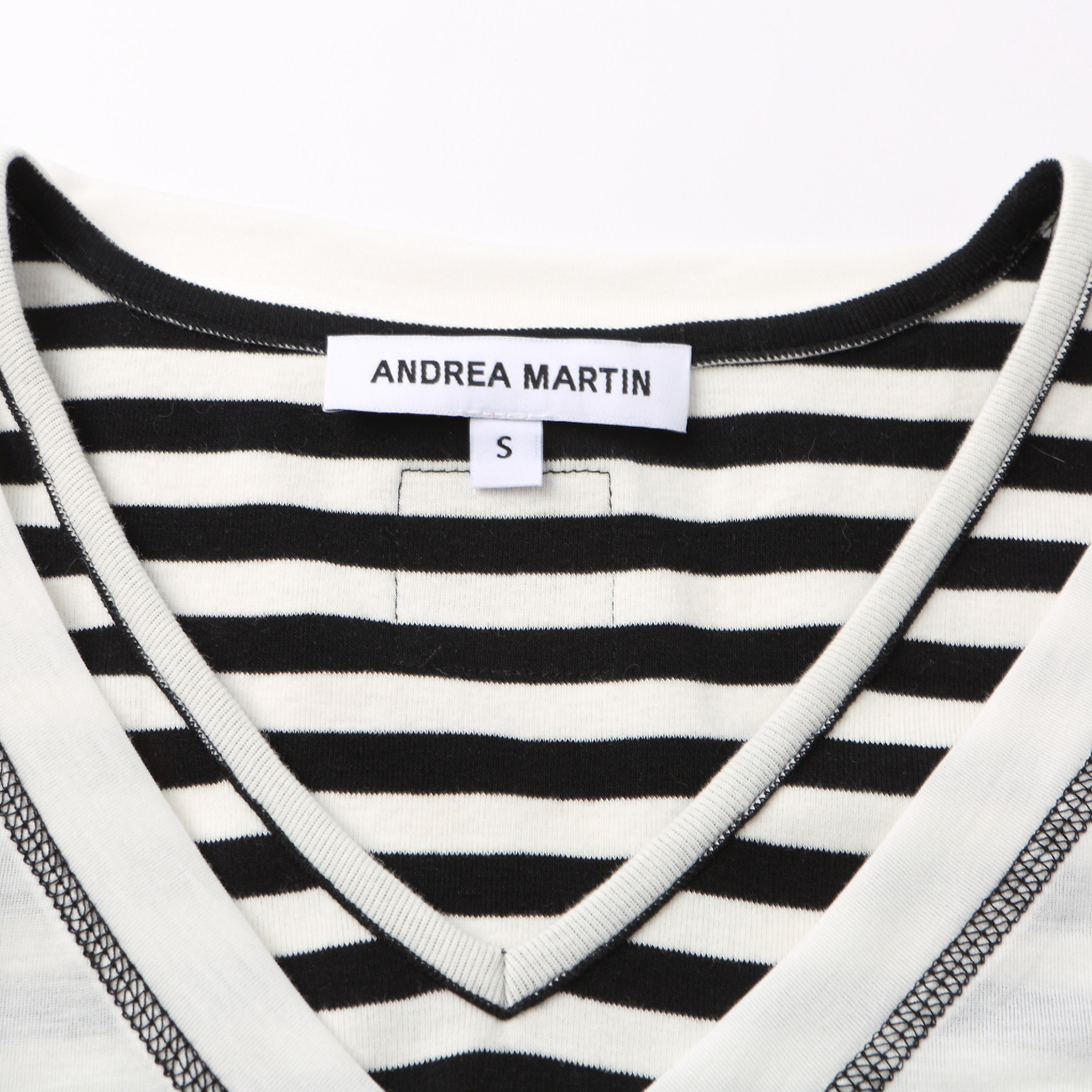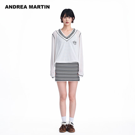 ANDREA MARTIN秋季新款黑白条纹假两件套背心女V领宽松连衣裙
