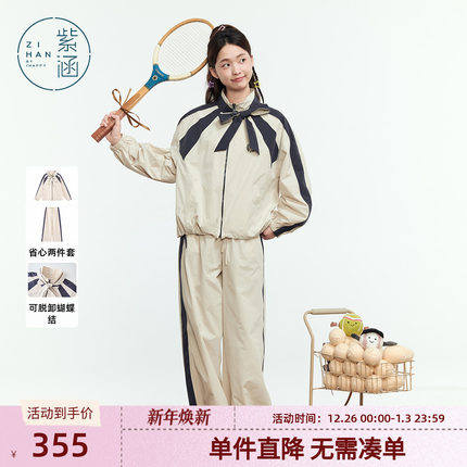 紫涵立领蝴蝶结拉链外套直筒裤子通勤休闲运动两件套装女秋季新款