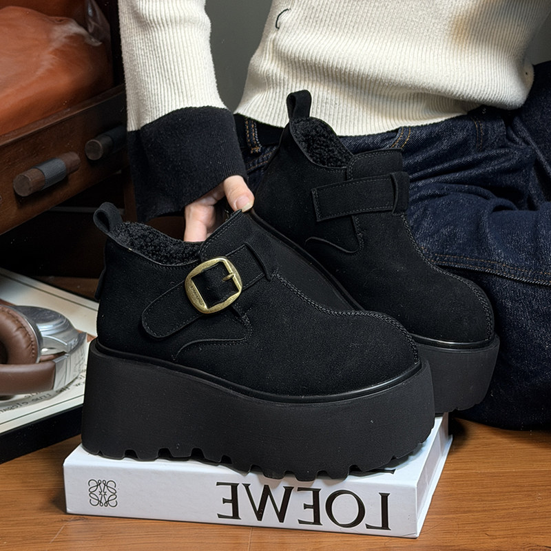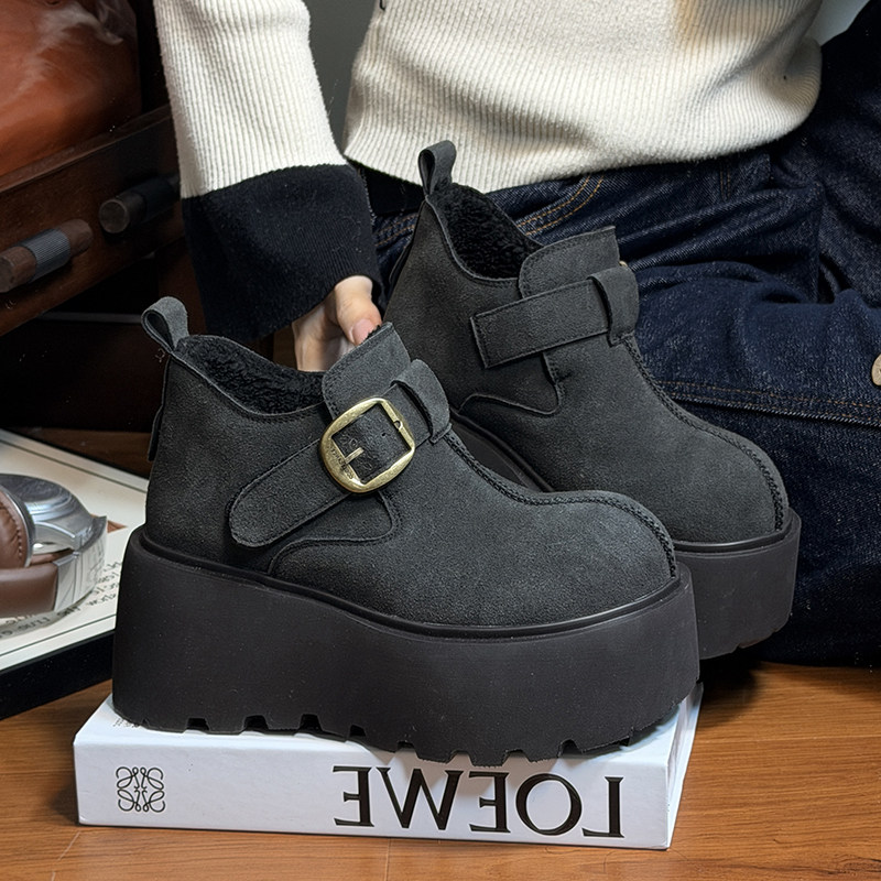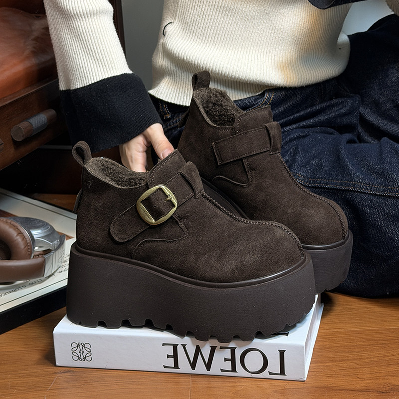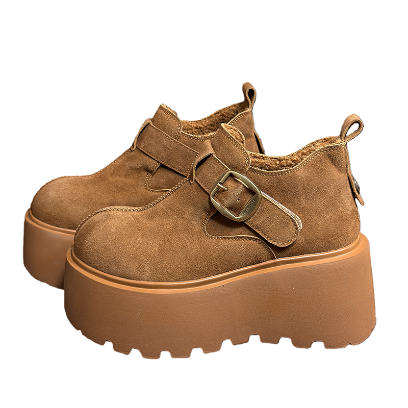 复古真皮圆头松糕厚底雪地棉鞋女复古加绒勃肯鞋小个子增高乐福鞋