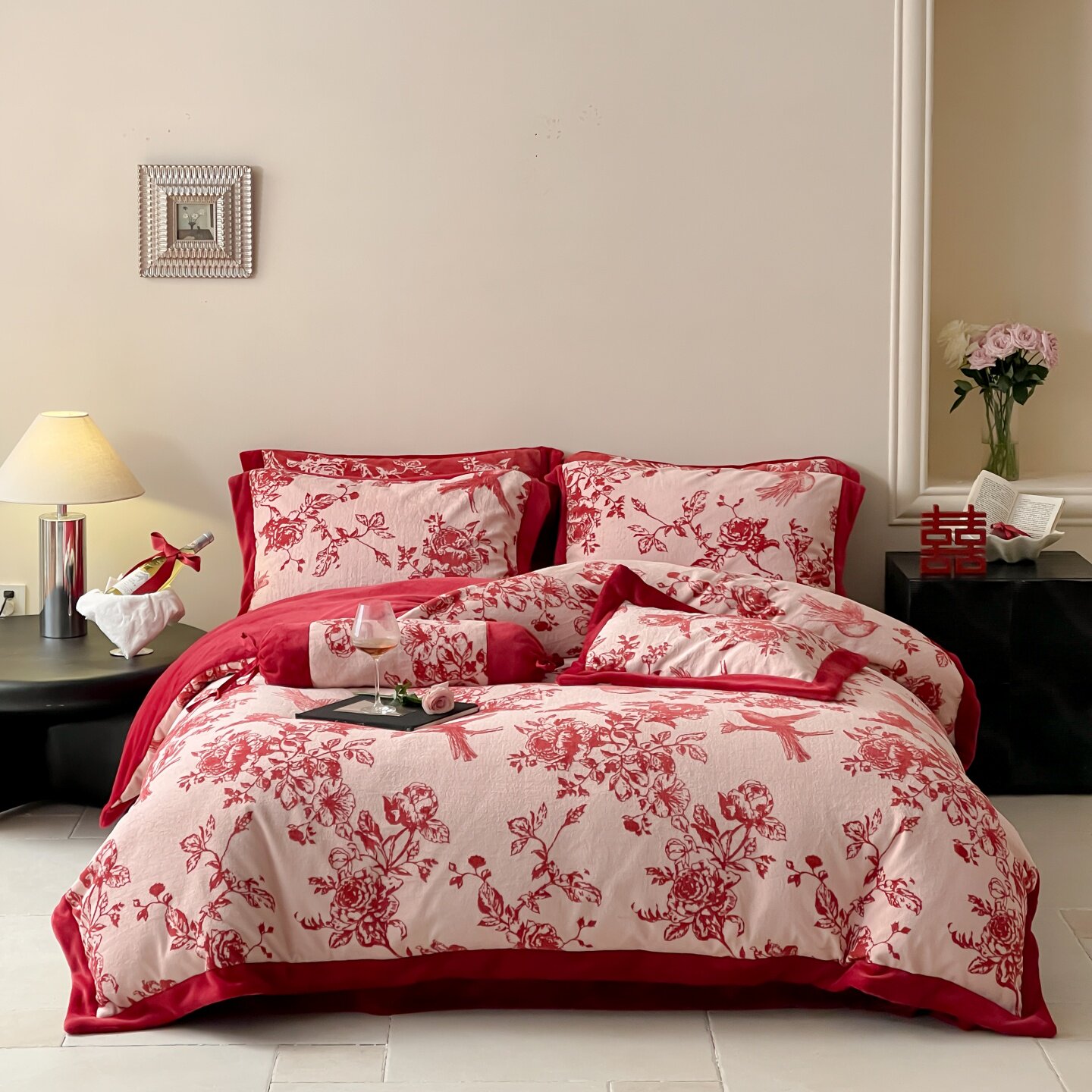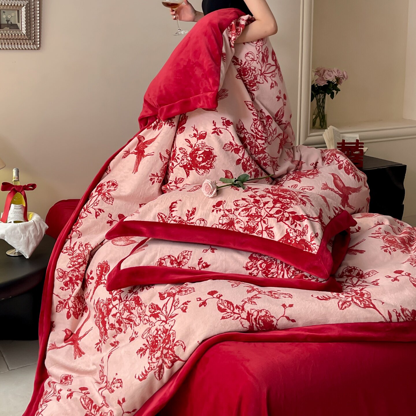 红色喜庆加厚牛奶绒四件套
