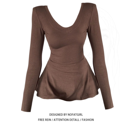 大码胖mm韩系复古V领长袖T恤女秋季新款修身显瘦掐腰打底内搭上衣
