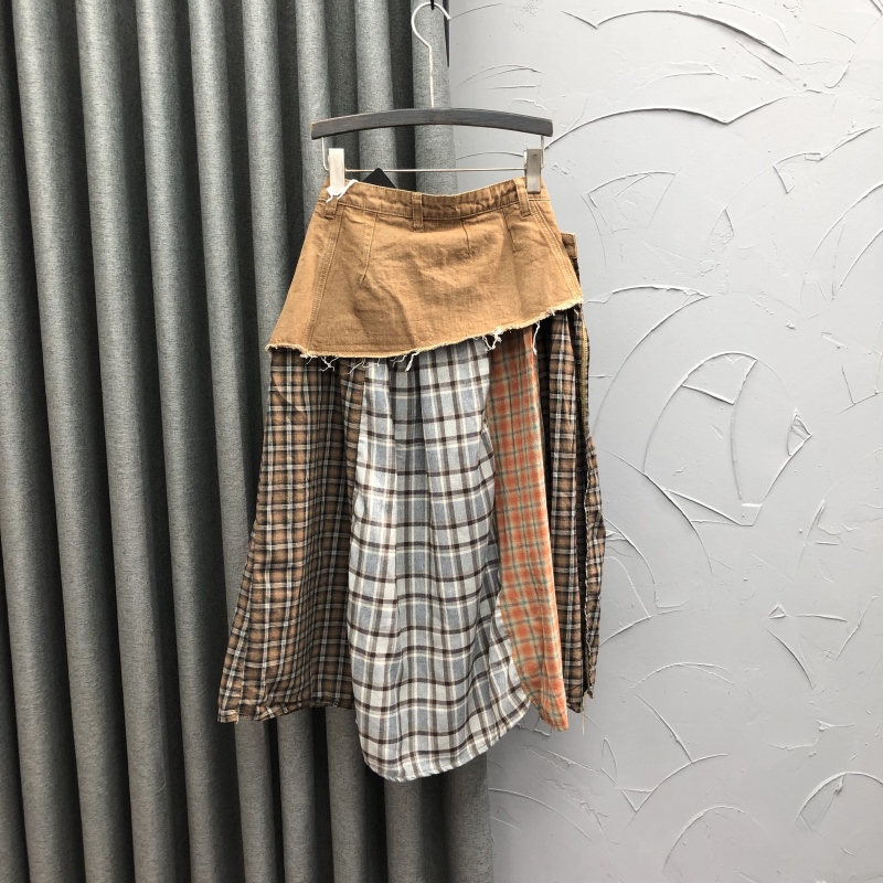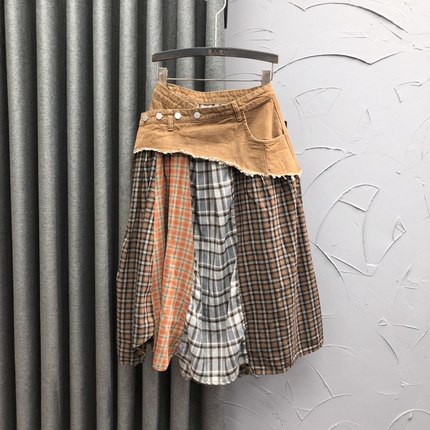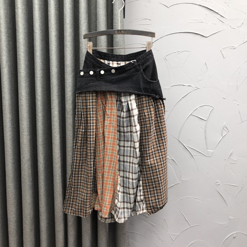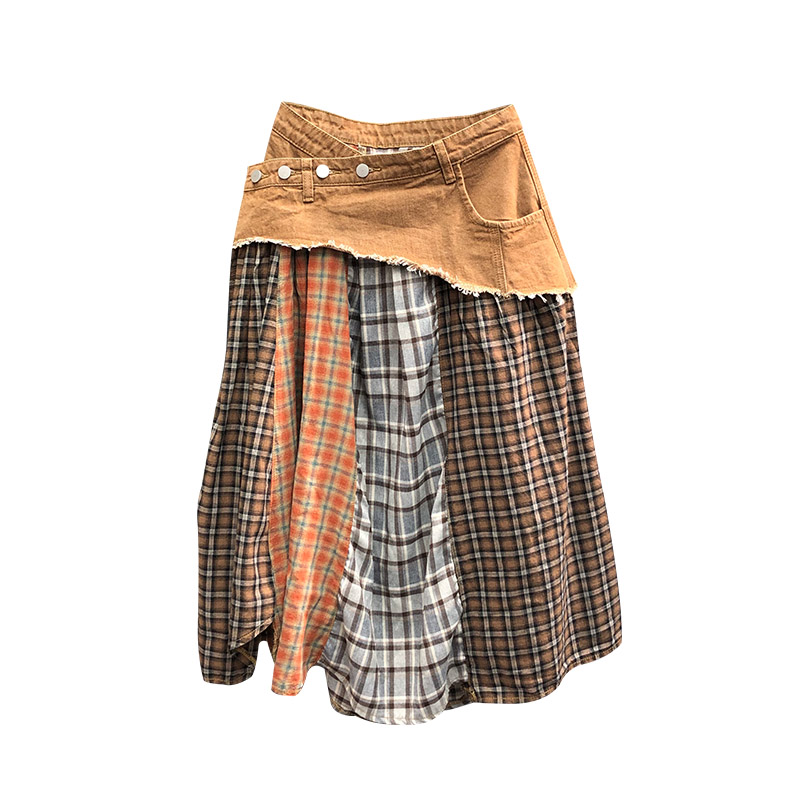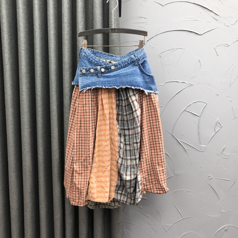 个性高腰休闲格子拼接牛仔裙女春夏时尚洋气辣妹A字中长半身裙子