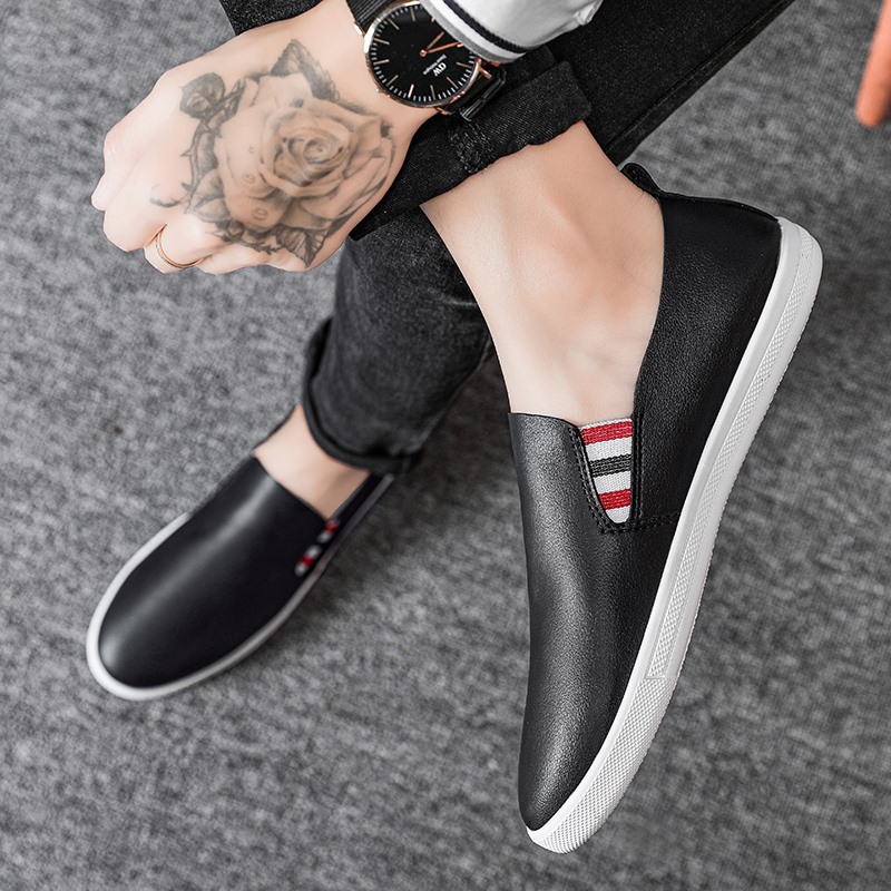 春秋季男士豆豆鞋皮鞋白色百搭青年真皮无鞋带懒人配九分裤休闲鞋