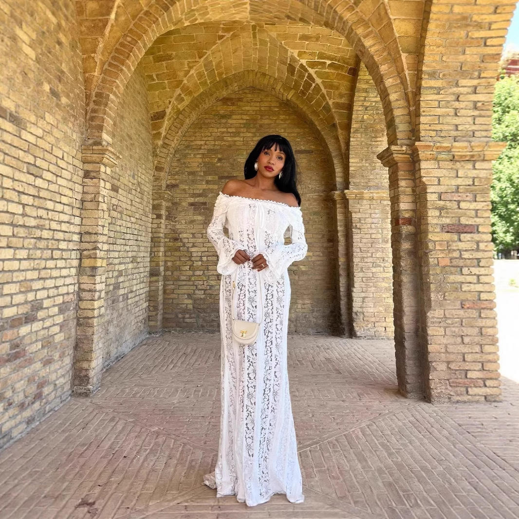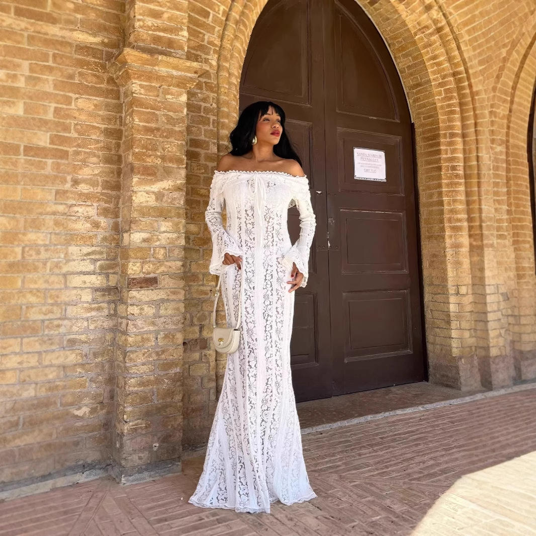 欧美风一字肩蕾丝连衣裙小众收腰辣妹长袖气质长款包臀裙常规袖