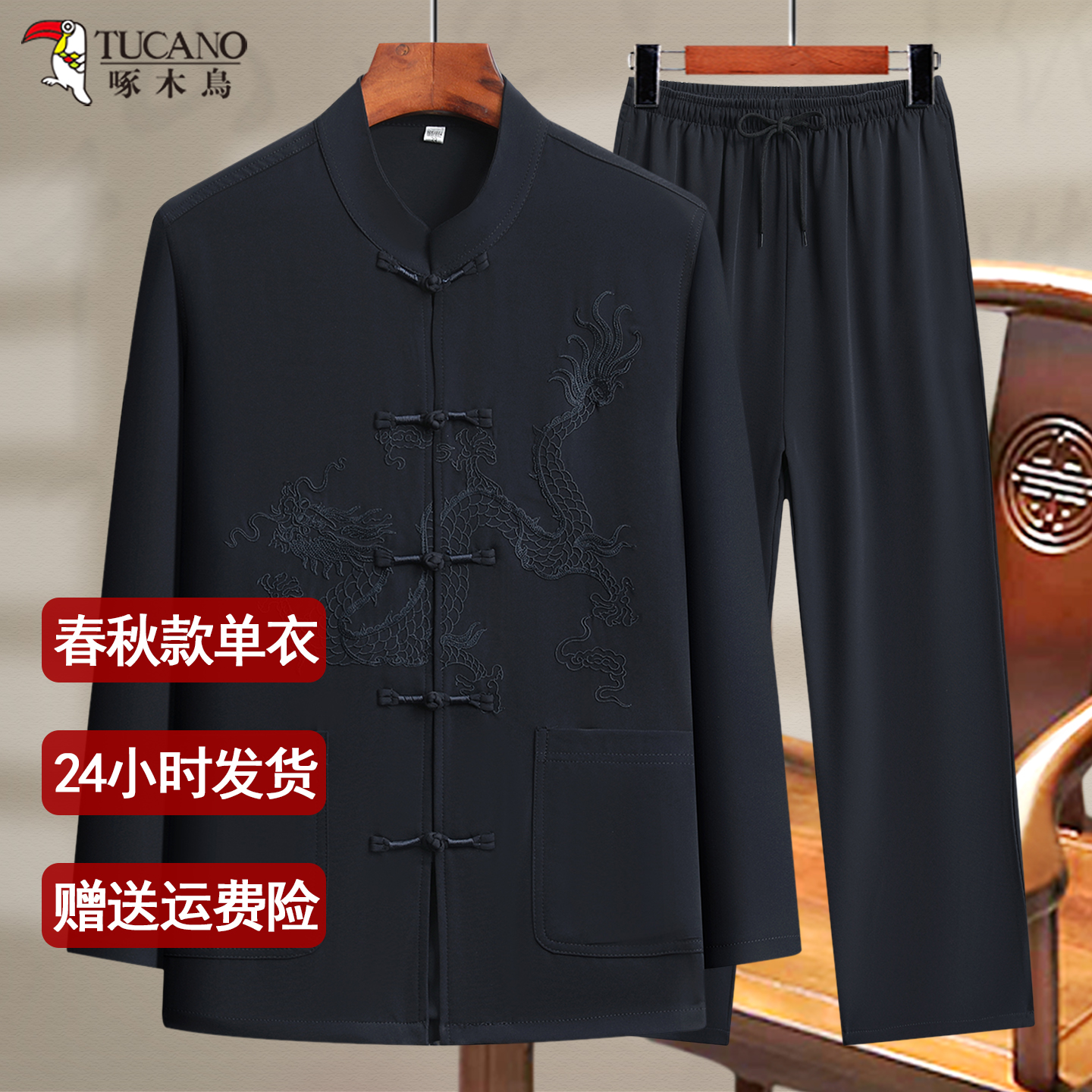 啄木鸟中老年唐装春秋薄款男士长袖衬衫新款中式刺绣爸爸国风套装