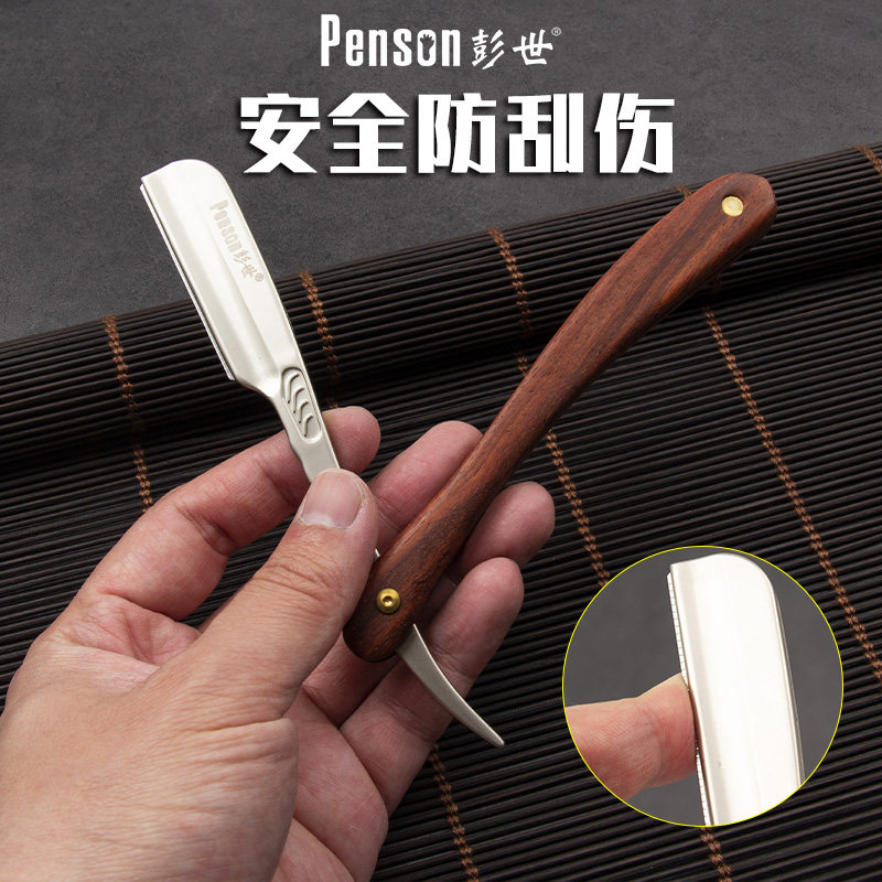 彭世檀木柄防刮伤老式剃刀剃须刀修面刮胡刮理发修眉刮脸安全刀片