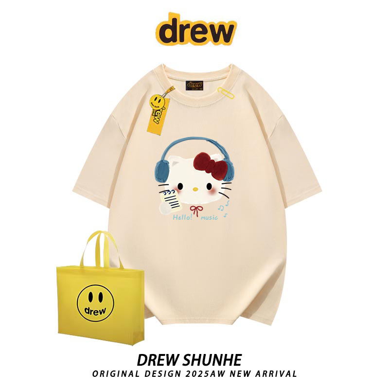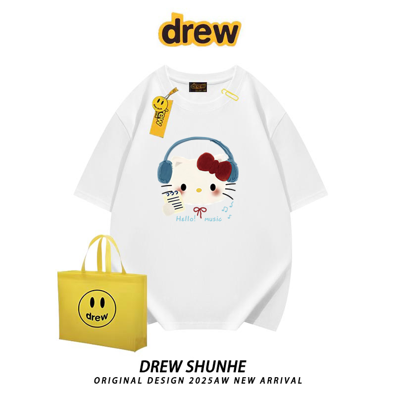 drew美式潮牌笑脸联名HelloKitty短袖T恤男女情侣宽松半袖上衣tee