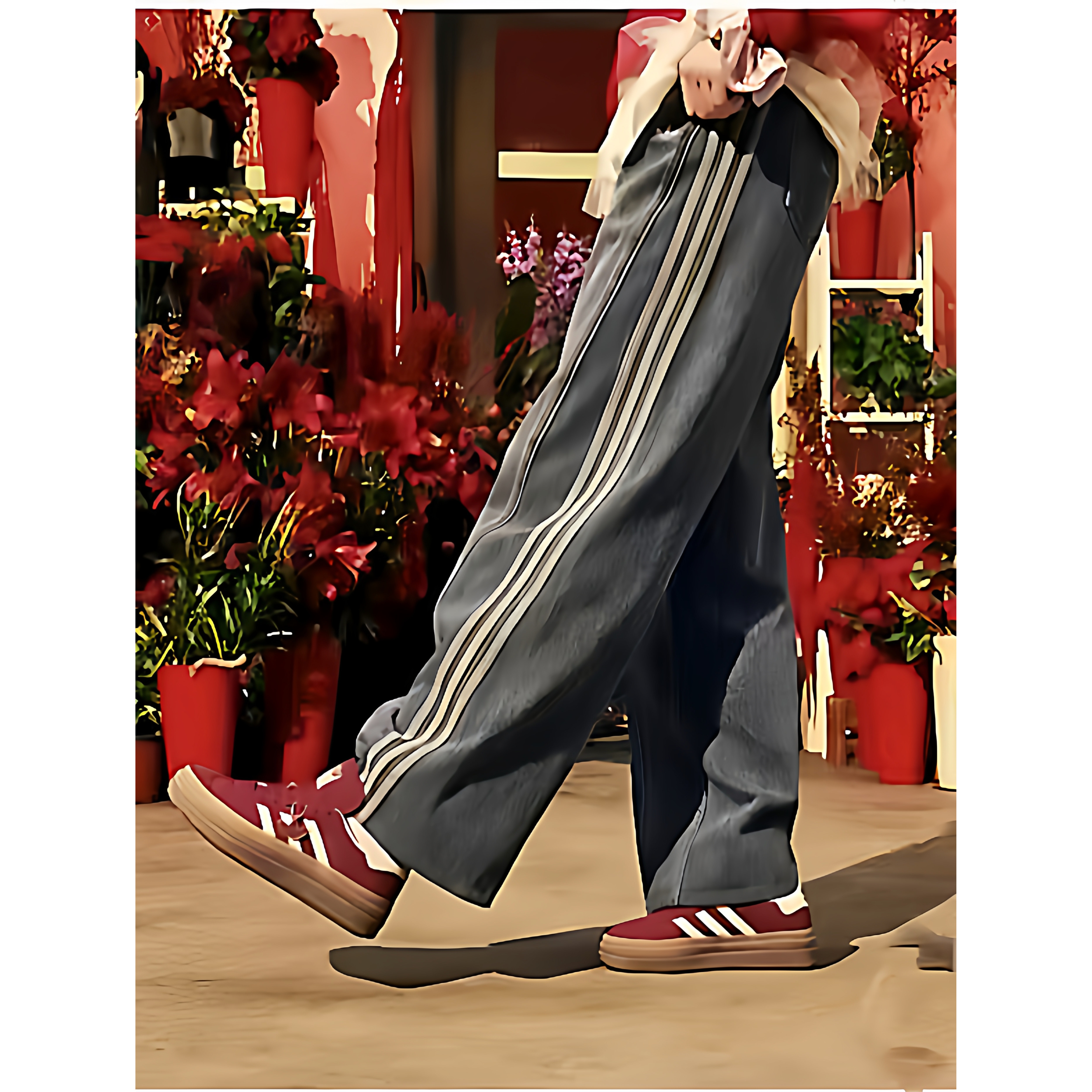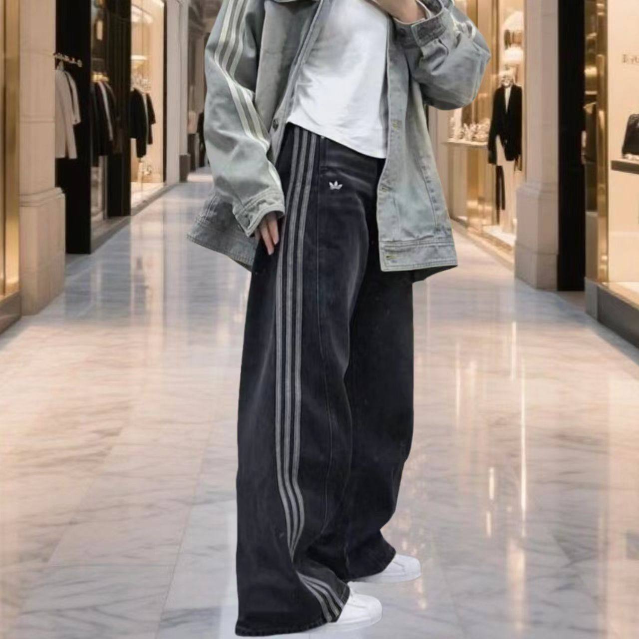 宋雨琦同款三条杠复古牛仔裤女显瘦宽松阔腿裤运动休闲水洗直筒裤
