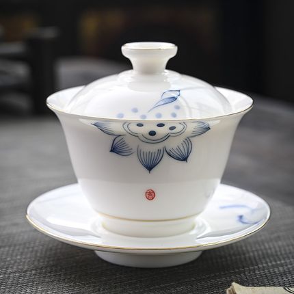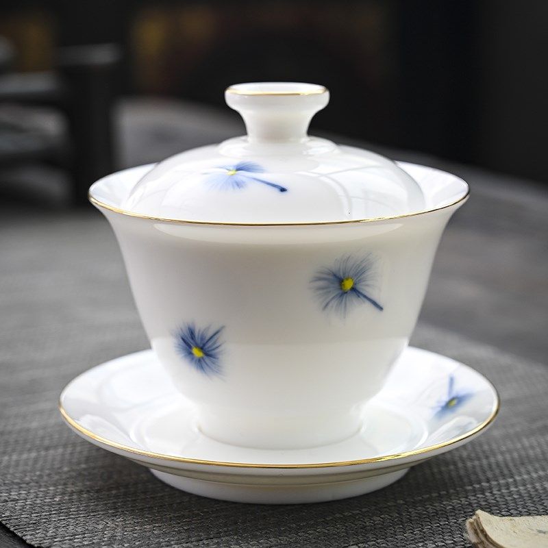 羊脂玉盖碗茶杯手绘白瓷泡茶碗三才青花瓷大号釉下彩功夫茶具套装