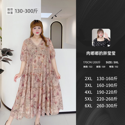 300斤胖莹莹特大码女装碎花温柔甜美V领轻薄飘逸遮肉显瘦长连衣裙