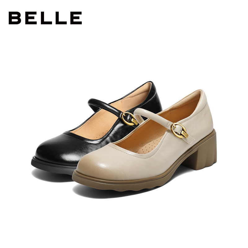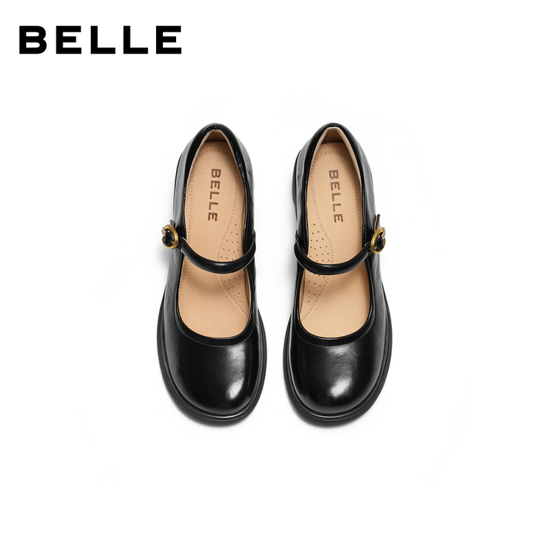 百丽复古粗高跟玛丽珍鞋女2025秋季新款黑色浅口单鞋子E3X1DCQ5