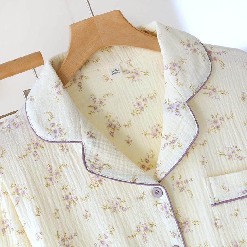 2026春女士纯棉双层纱睡衣大码翻领长袖甜美碎花四季款家居服