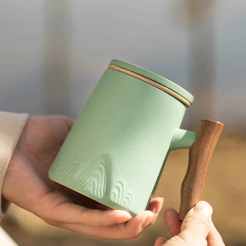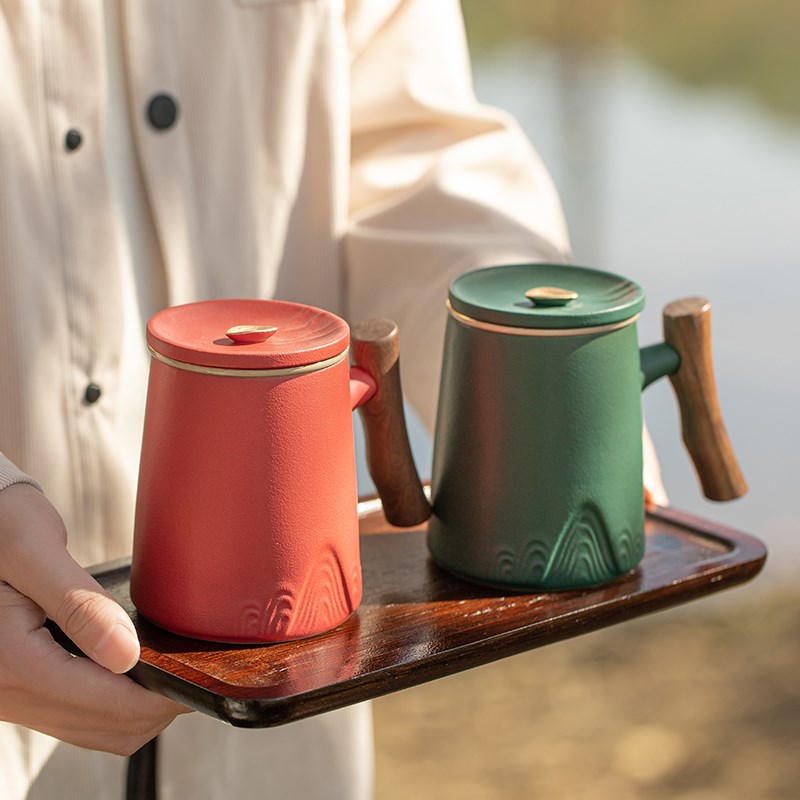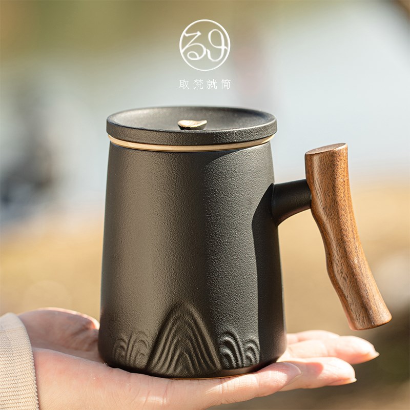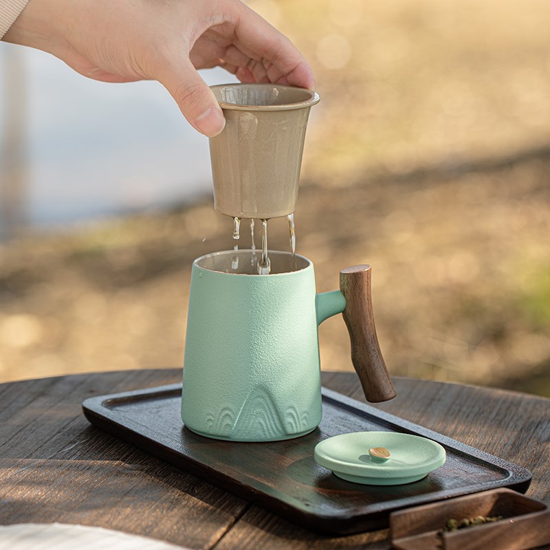 木柄茶水分离泡茶杯单个人喝茶办公室带盖过滤陶瓷杯定制