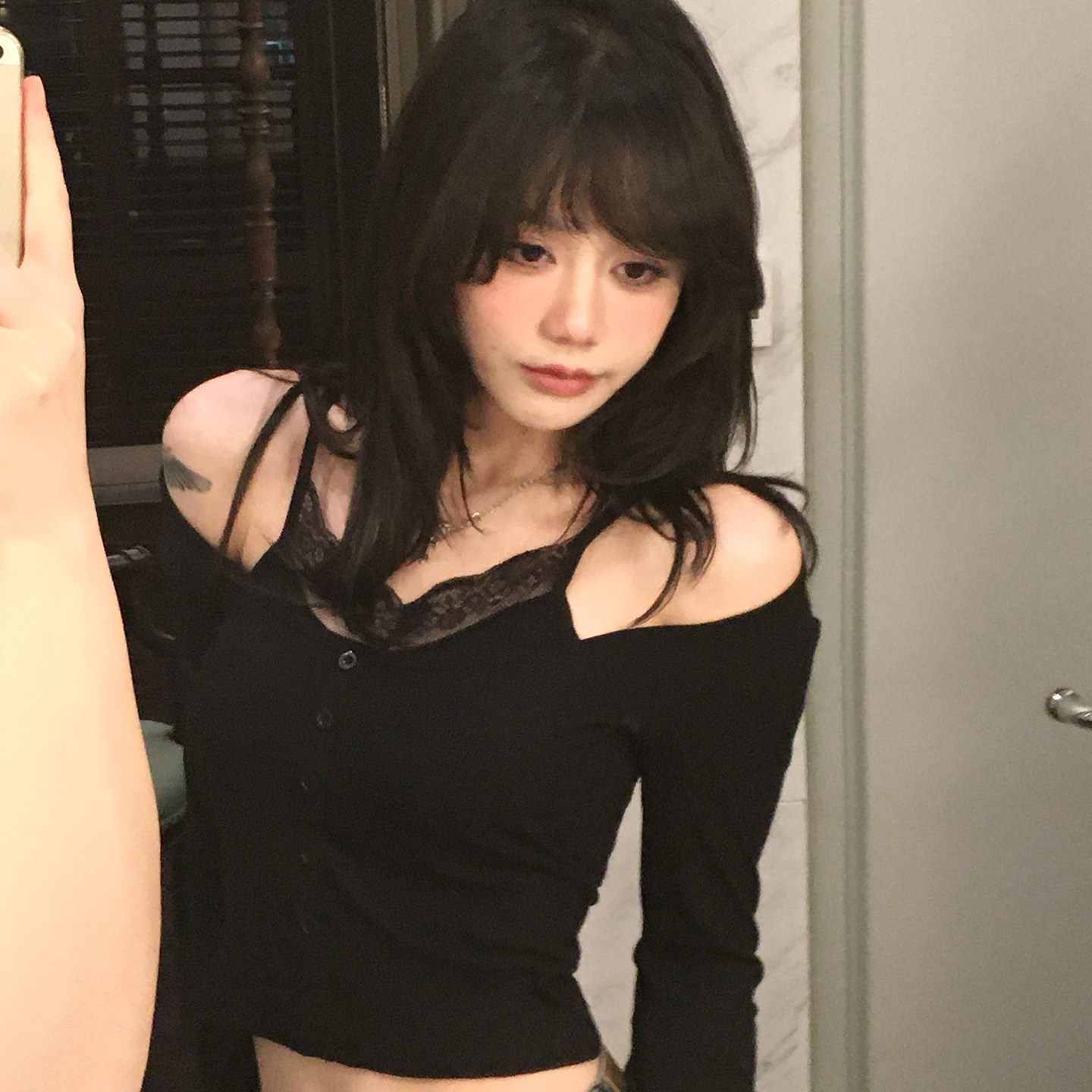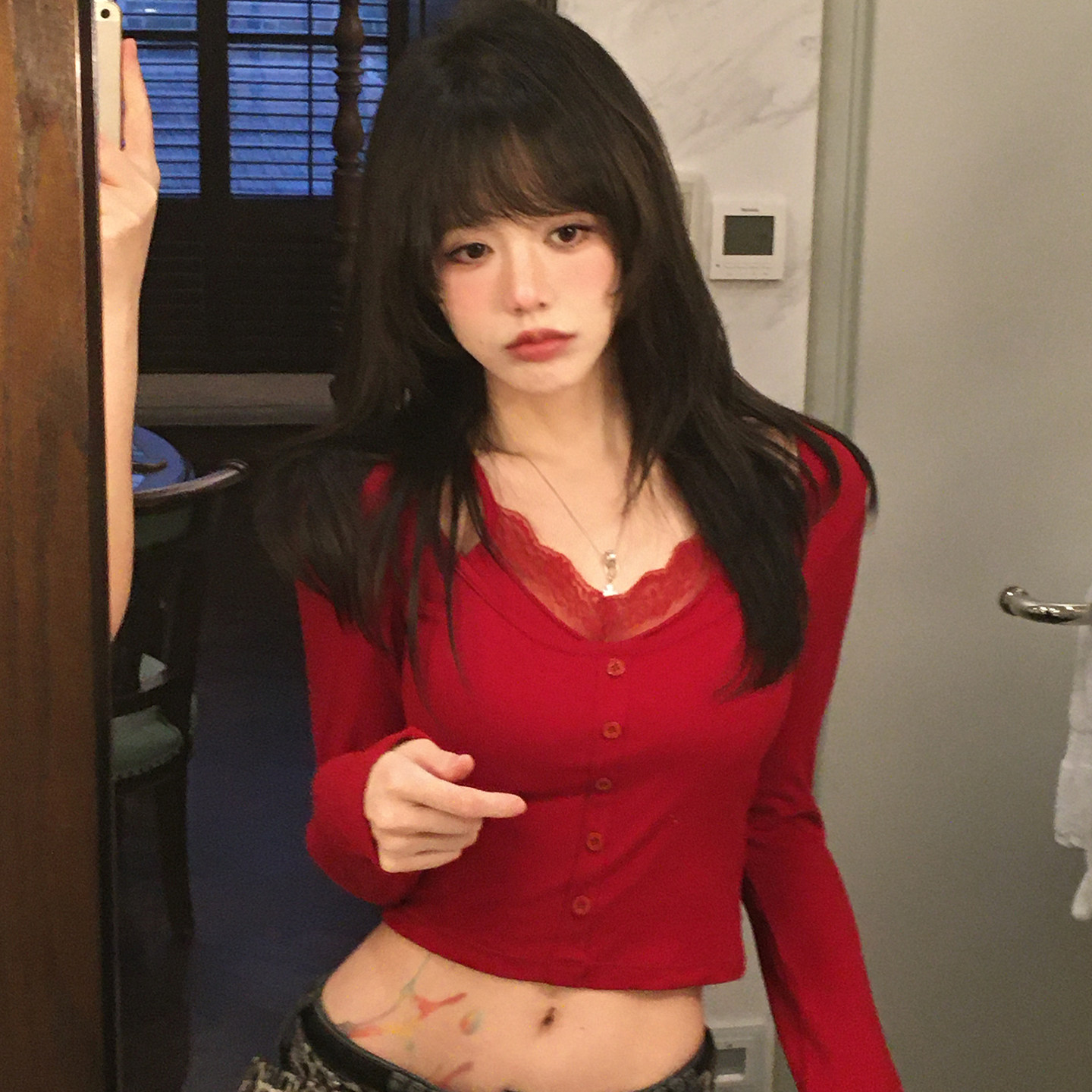 fortylions纯欲假两件蕾丝长袖上衣U领修身T恤假两件蕾丝百搭上衣