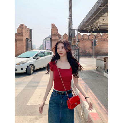 MULVAN 红色方领短袖T恤女夏季新款修身高腰短款小飞袖上衣