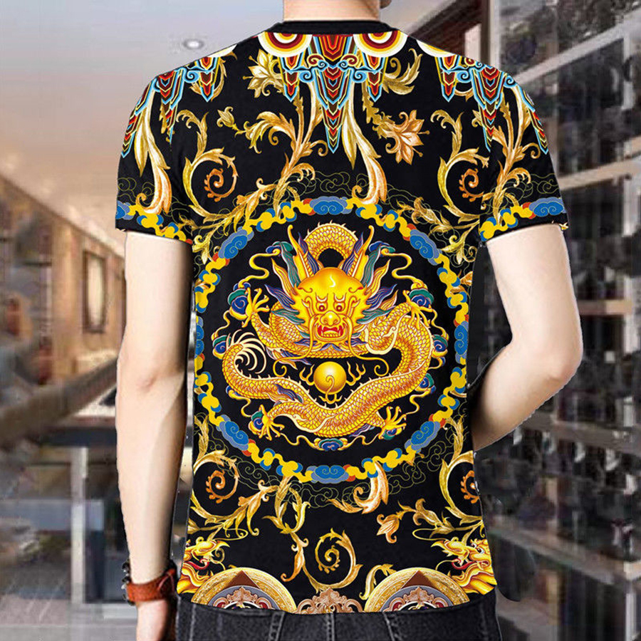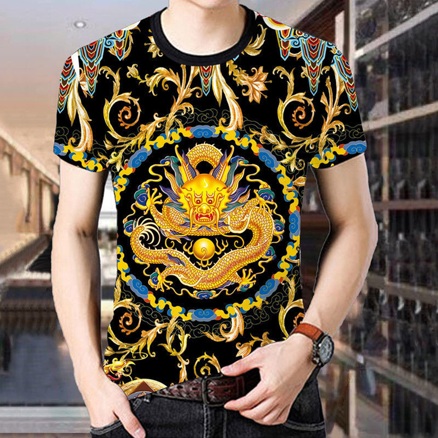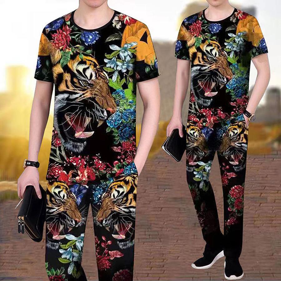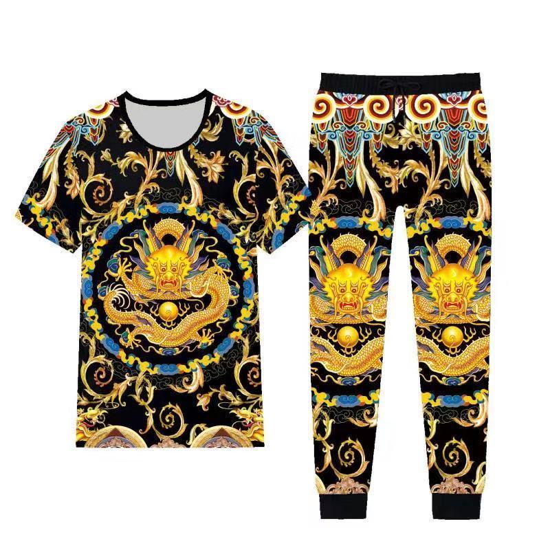 2025新款男士休闲套装短袖长裤中国风3D印花青年T恤金龙图案花裤