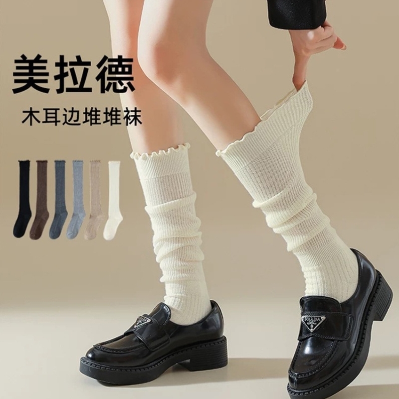 小腿袜子女春秋纯棉中筒袜显瘦花边jk袜白色堆堆袜搭配靴子长筒袜
