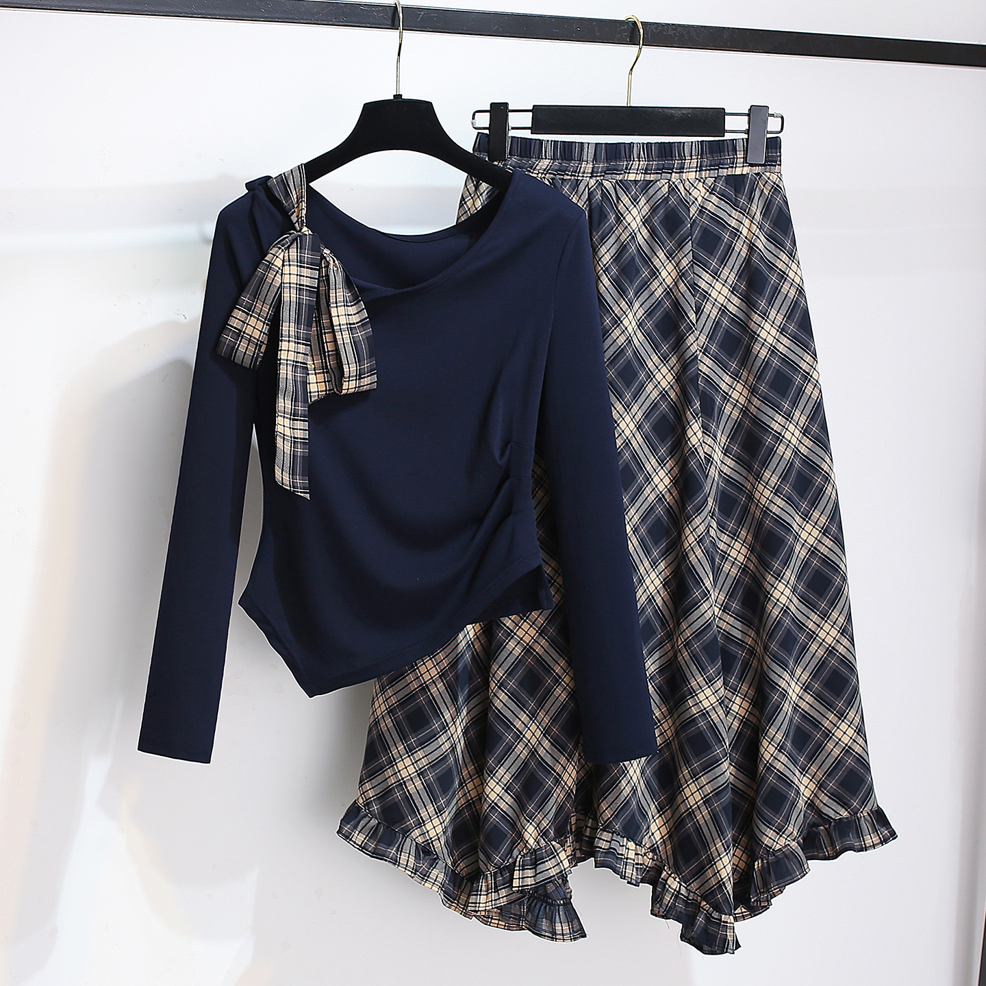 咖色斜领露肩长袖T恤雪纺格纹半身裙女套装2025早秋装新款连衣裙