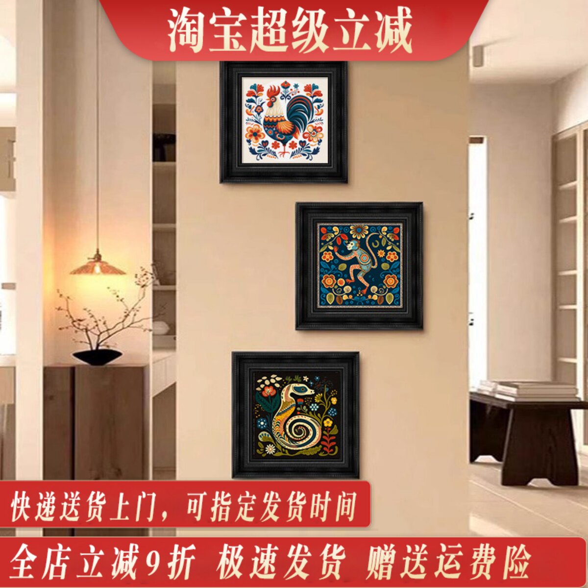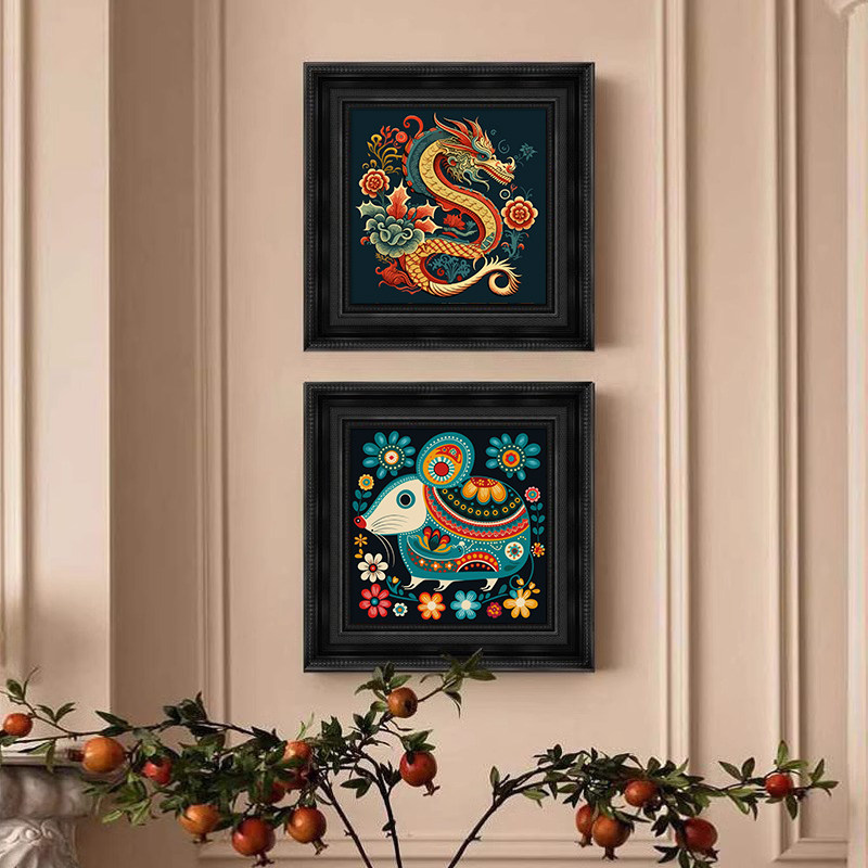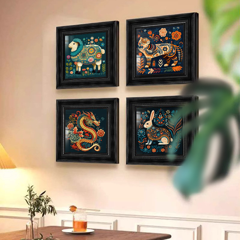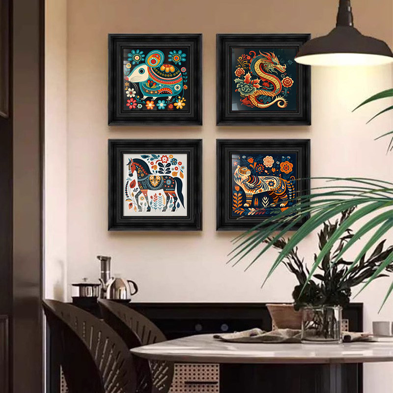 美式复古餐厅中古国风客厅装饰画高级感小众艺术挂画十二生肖壁画