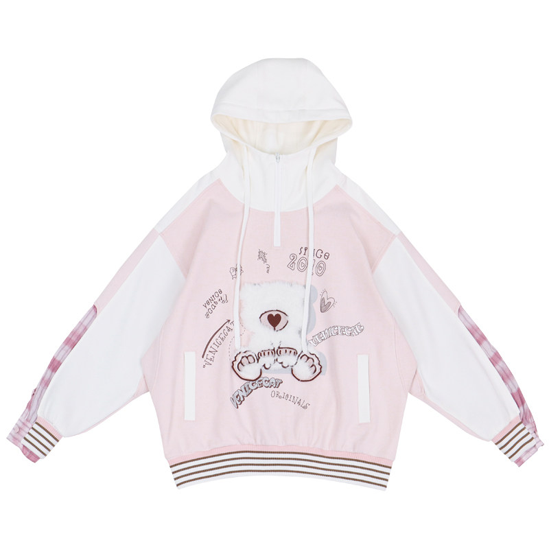 绣花小熊粉白蝙蝠袖连帽卫衣