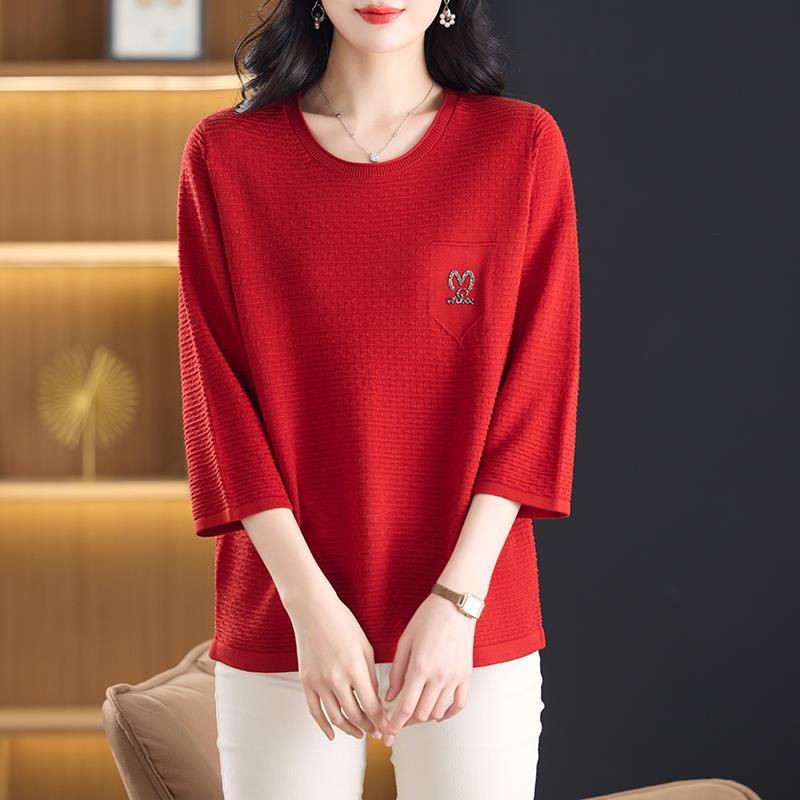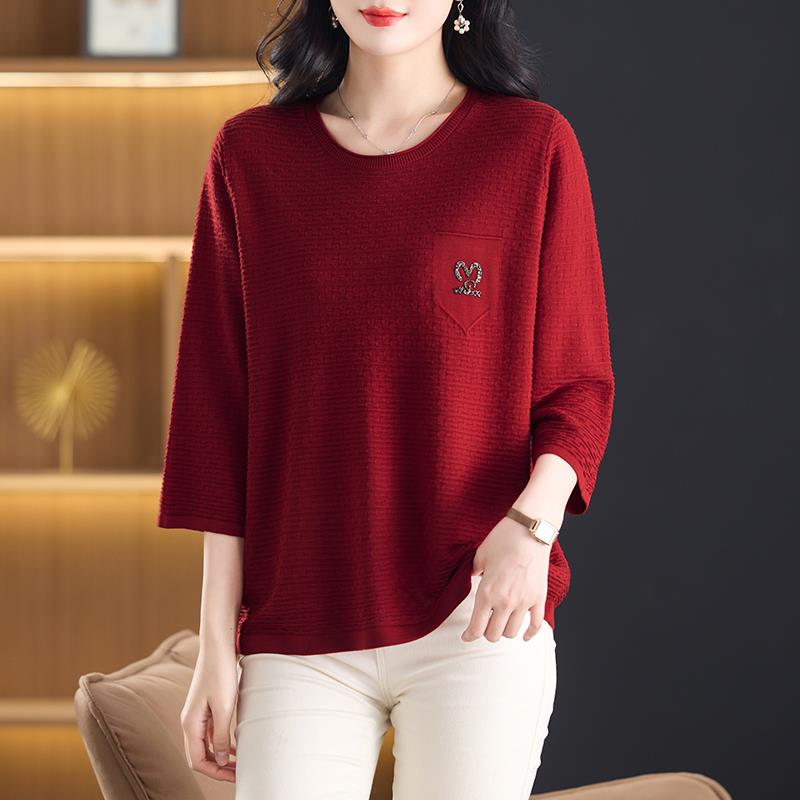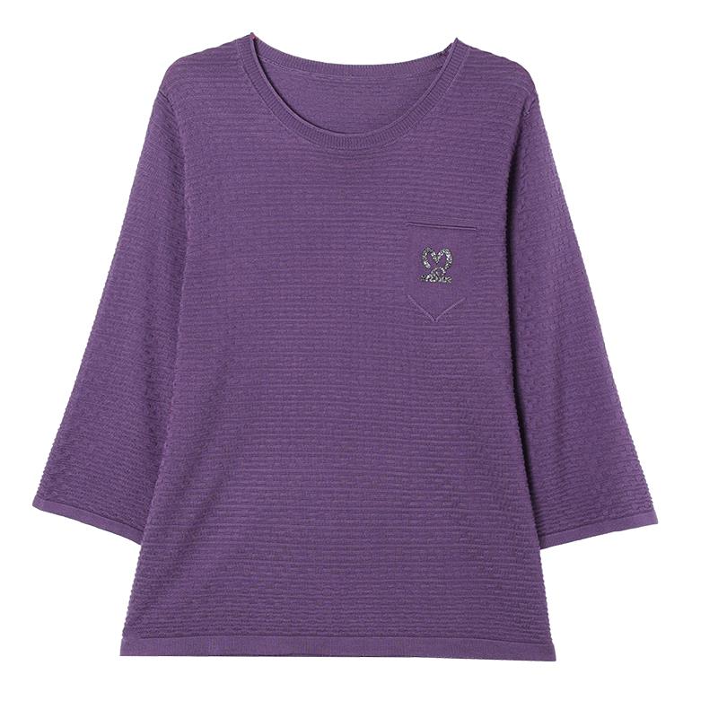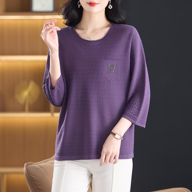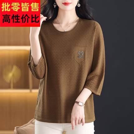 中年妈妈春秋圆领冰丝针织衫女加大码显瘦七分袖T恤遮肚洋派上衣