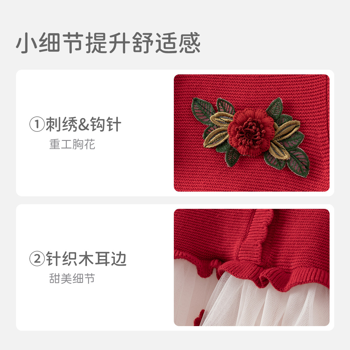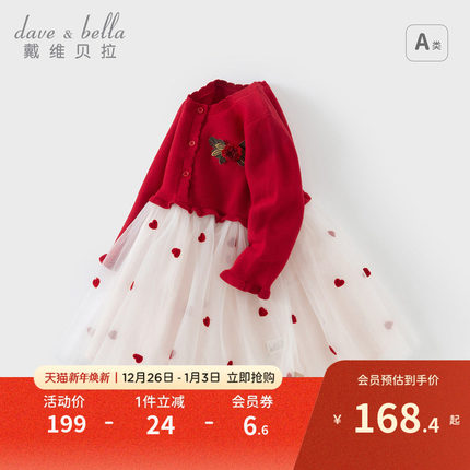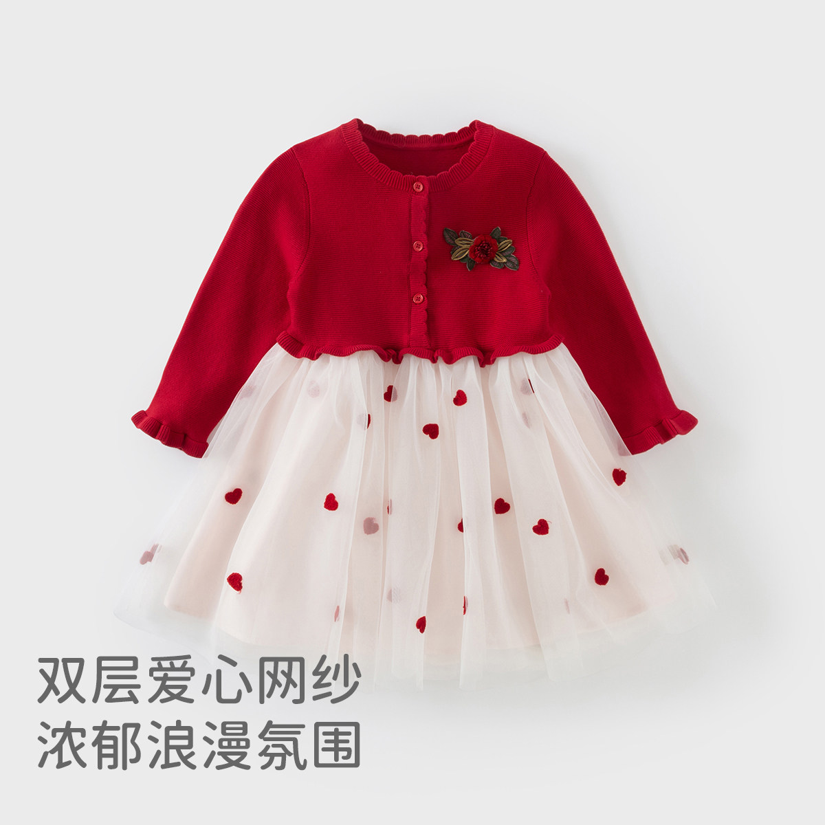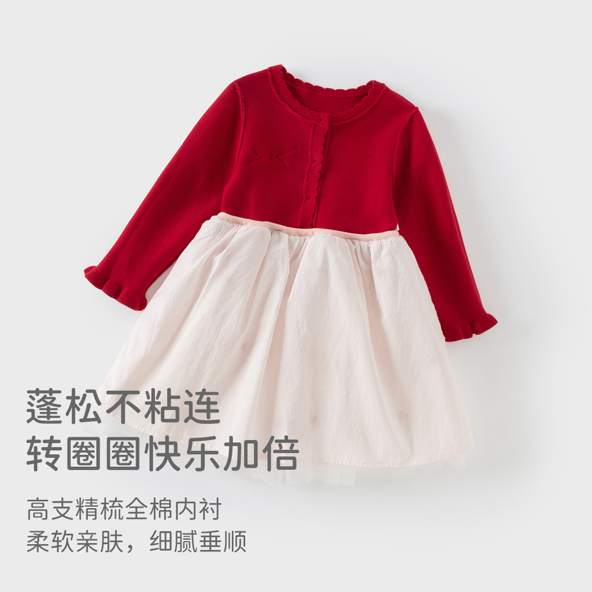 戴维贝拉儿童连衣裙春装女童针织毛衣网纱长袖红色新年裙子童装