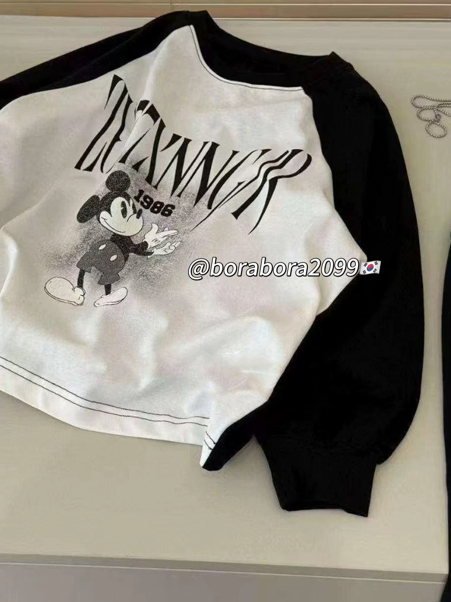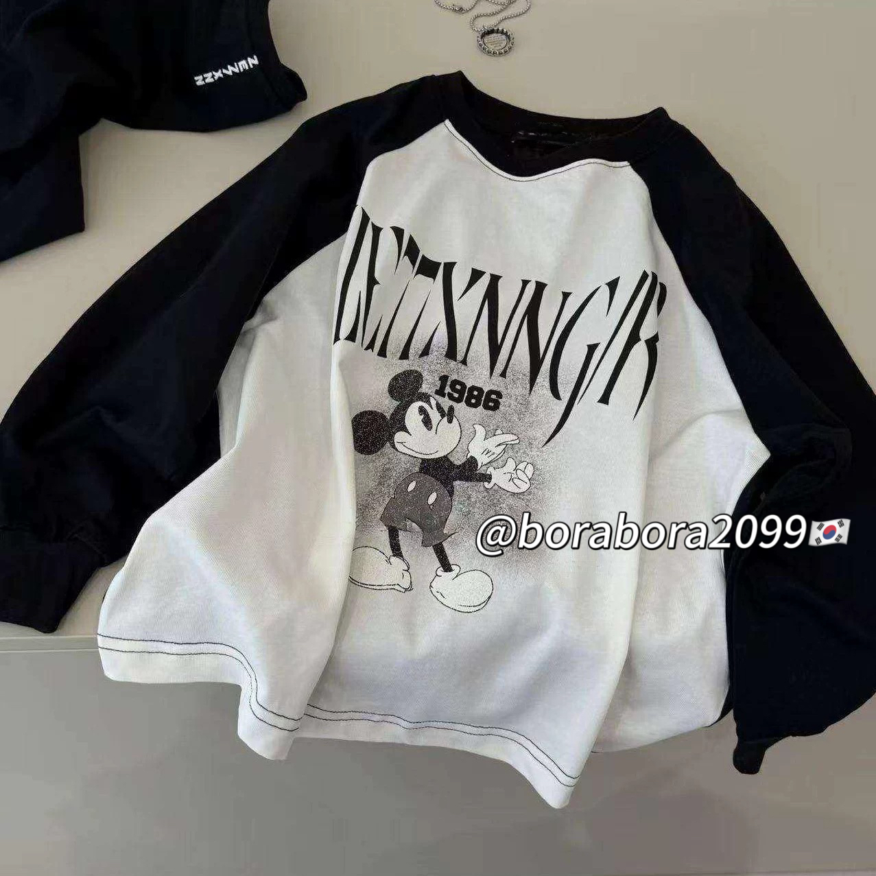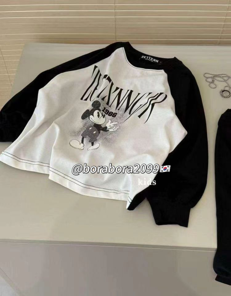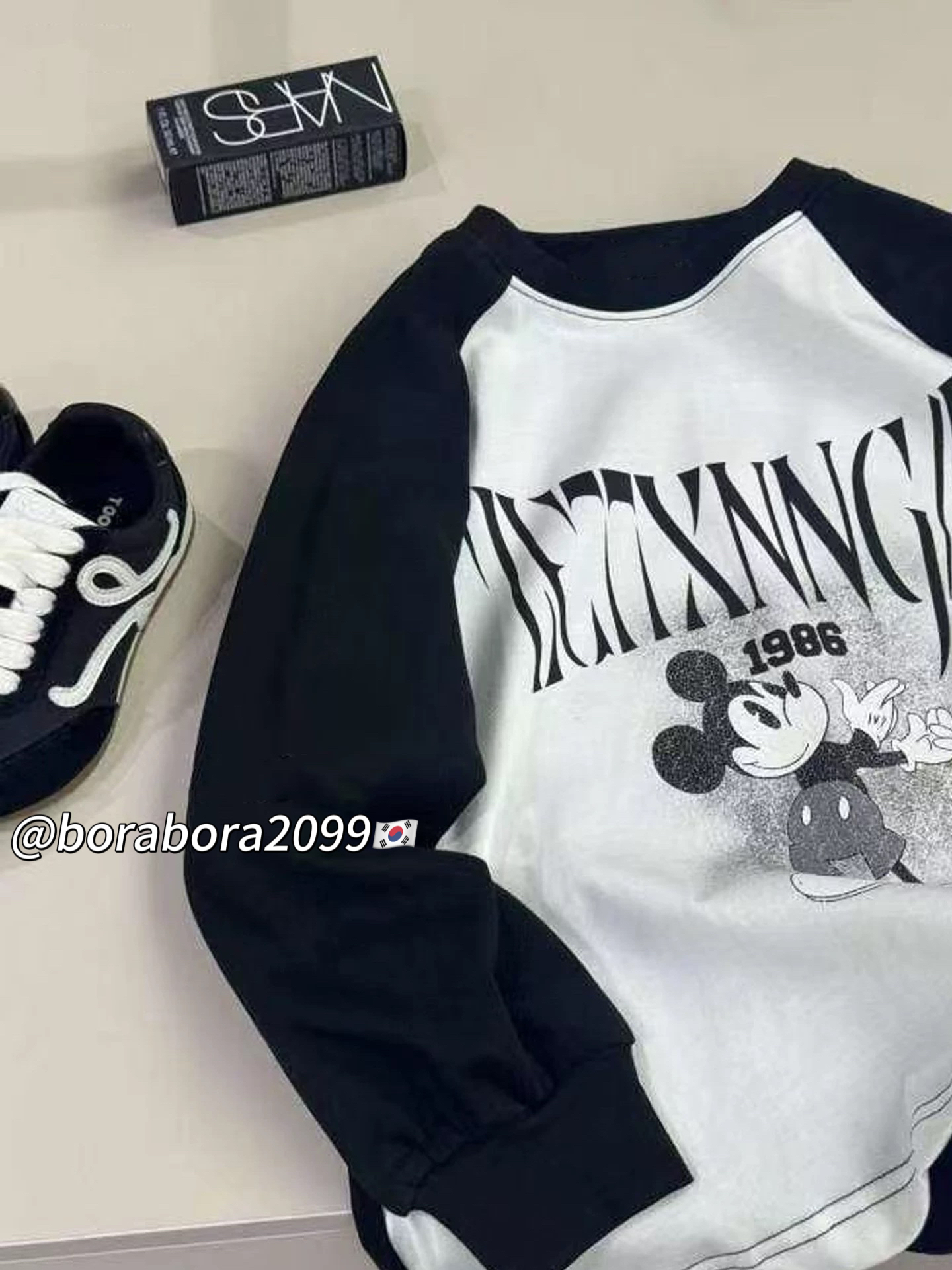 波拉韩国童装秋装男女童中大童青少年亲子卡通插肩袖拼色长袖T恤