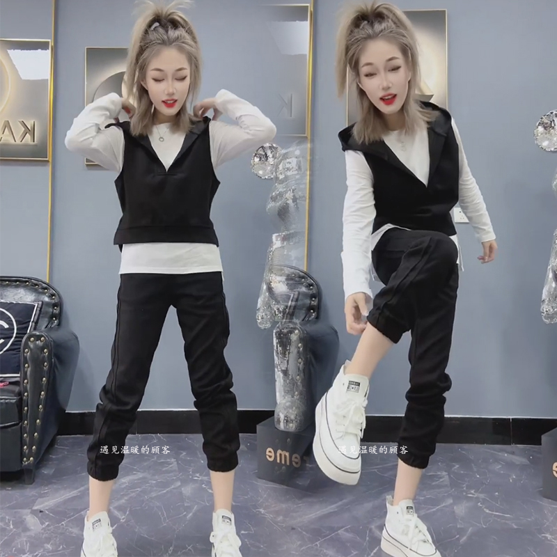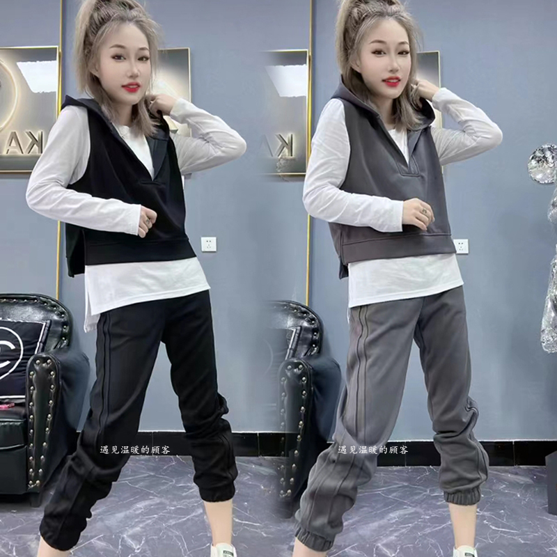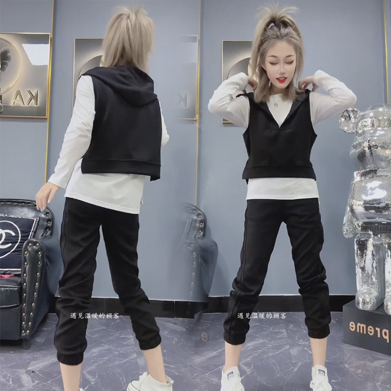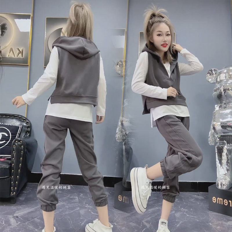 时尚套装女2025春季新款连帽马甲打底衫韩版高级感气质休闲三件套