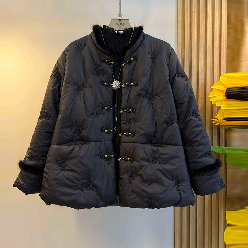 大码女装毛毛立领盘扣长袖棉服胖MM法式复古风洋气冬季款百搭上衣