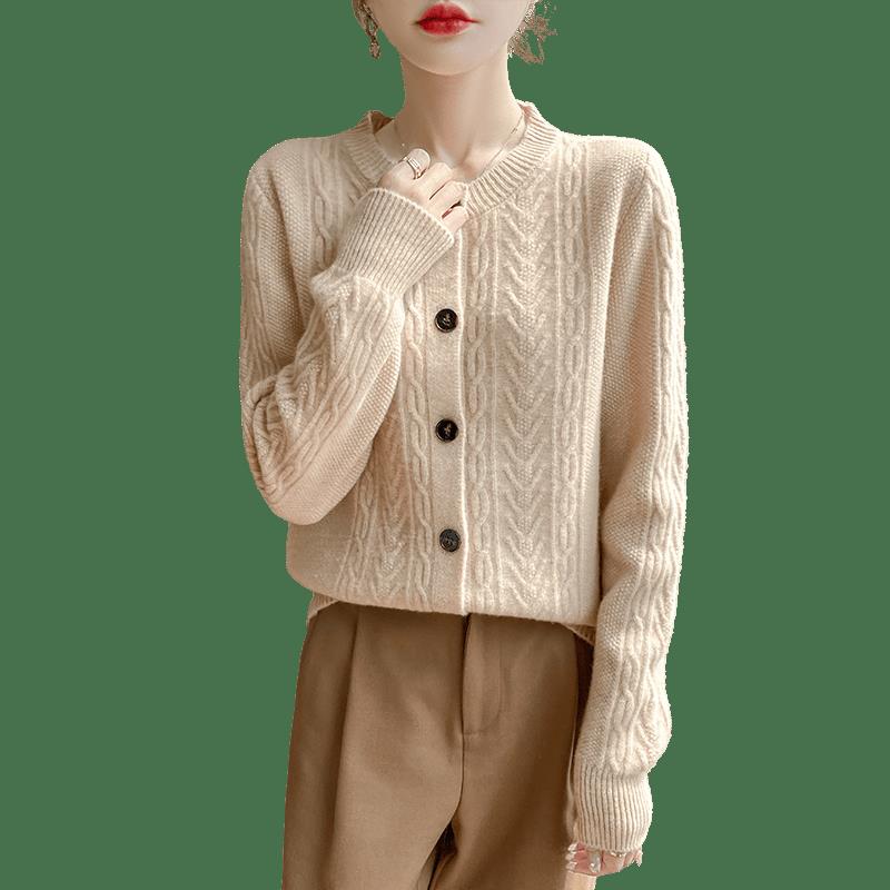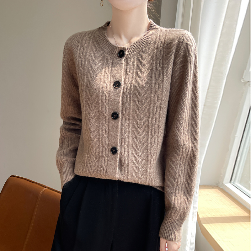 秋冬新款圆领绞花针衫宽松显瘦上衣毛衣外套时尚百搭女士羊毛开衫