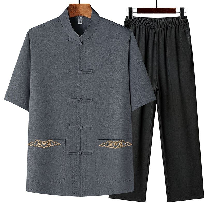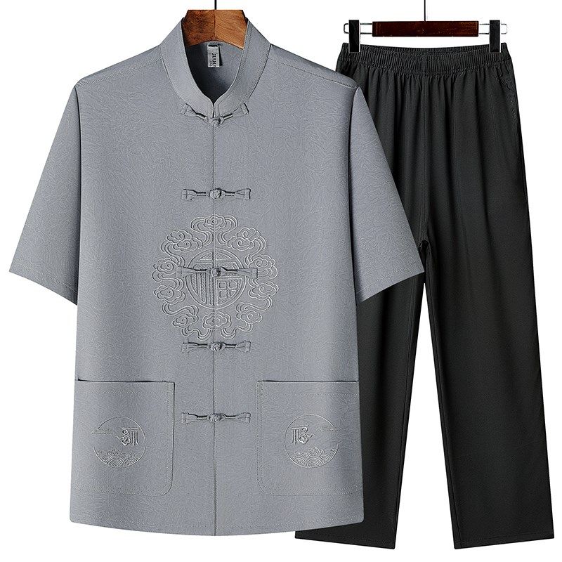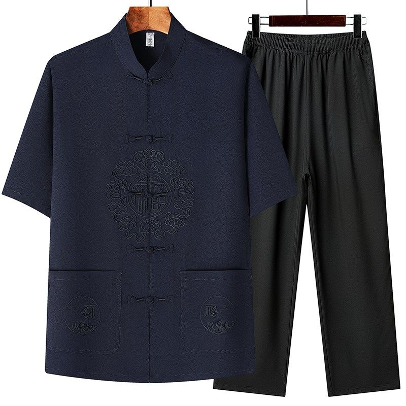 唐装男款中老年爸爸装短袖套装中国风父亲装中式衣服老人爷爷衬衫