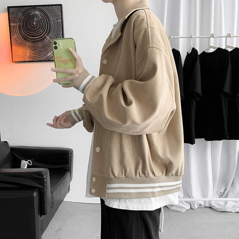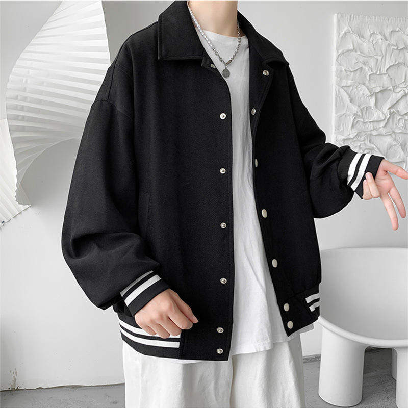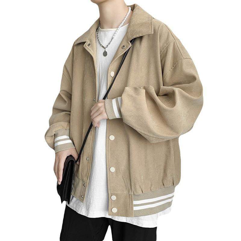 棒球服外套男春季加厚潮牌纯色翻领夹克港风宽松复古新款学生上衣